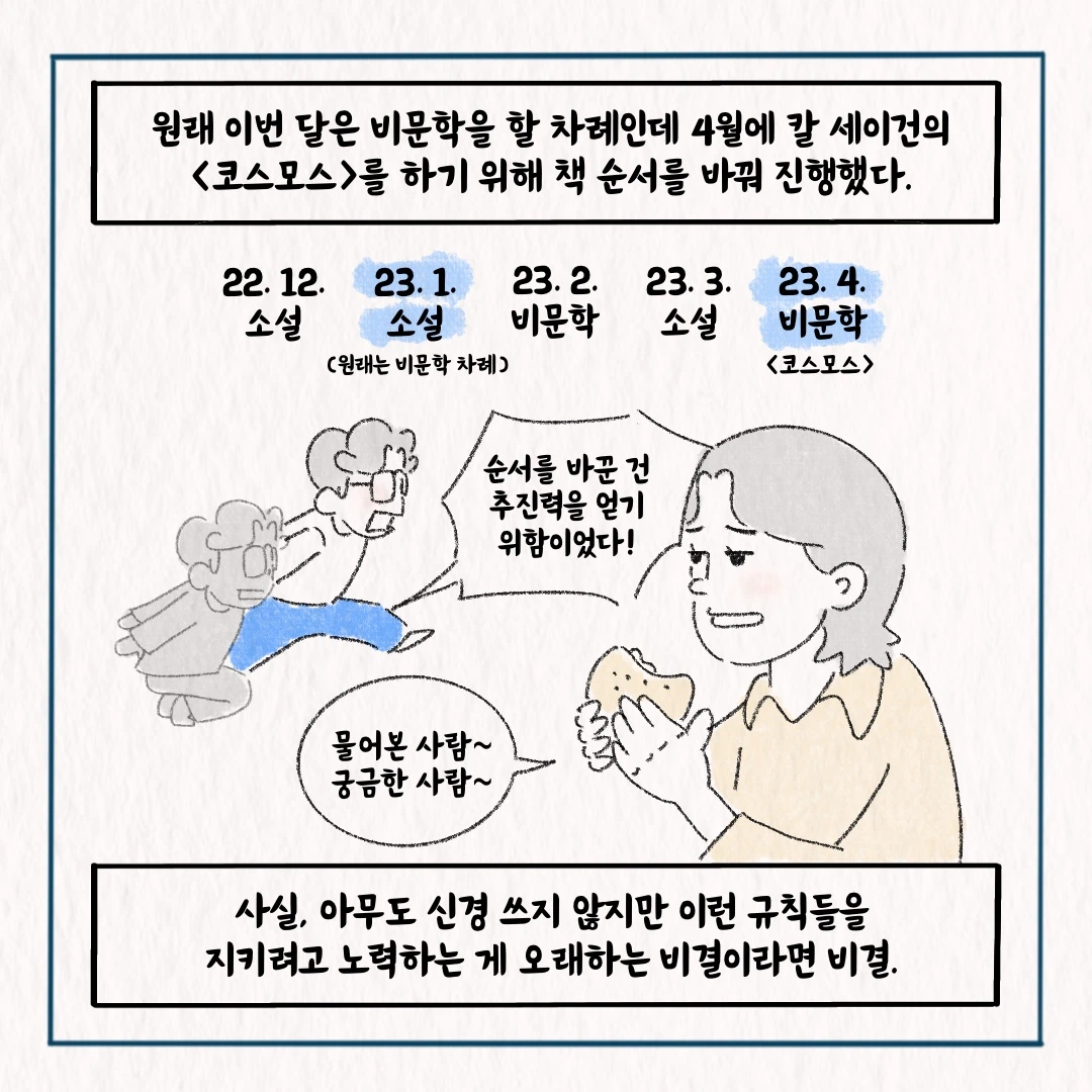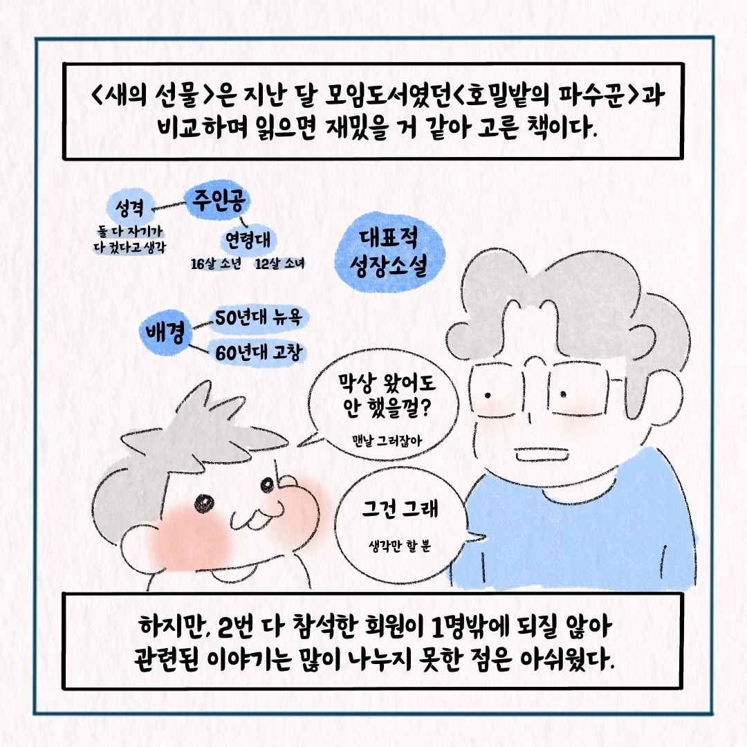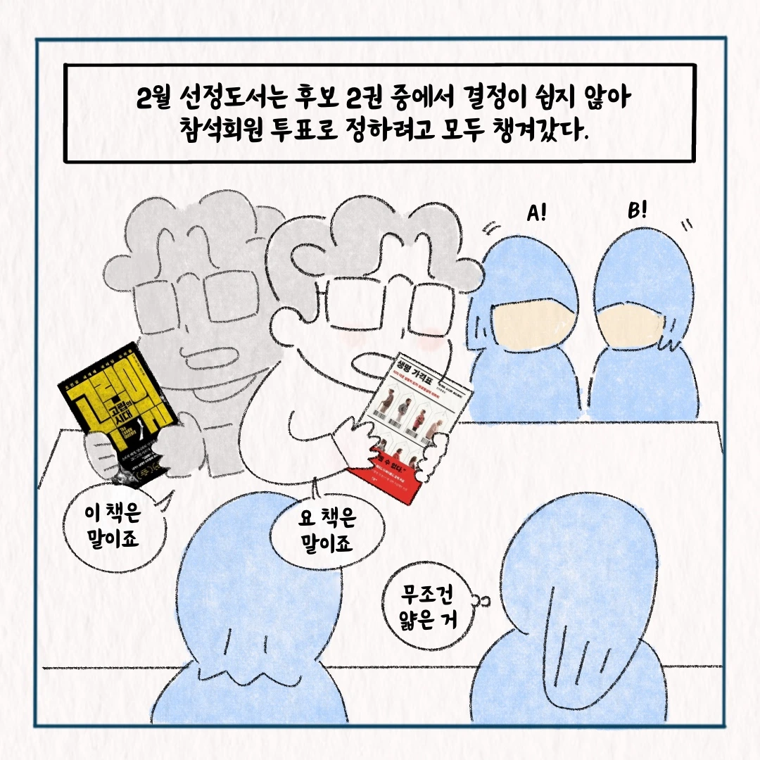'책에 관한 만화'를 연재하고 있습니다. 책 읽기보다는 책 사는 걸 좋아합니다. 2015년부터 한 독서모임의 모임장으로 지내고 있습니다. 책에 대한 이야기를 꾸준히 그리겠습니다.