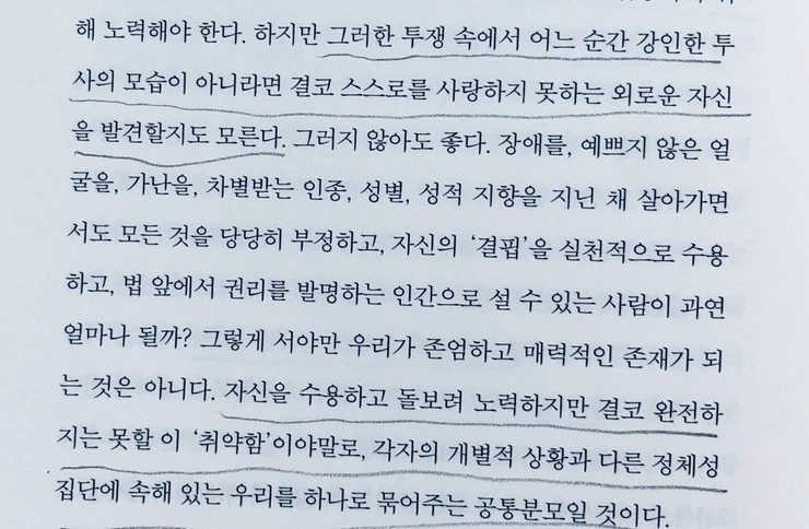나는 이 대목에서 울 작가님이 정말로 그 결핍이라고 생각되는 부분을 정체성으로 수용했구나를 느꼈다.