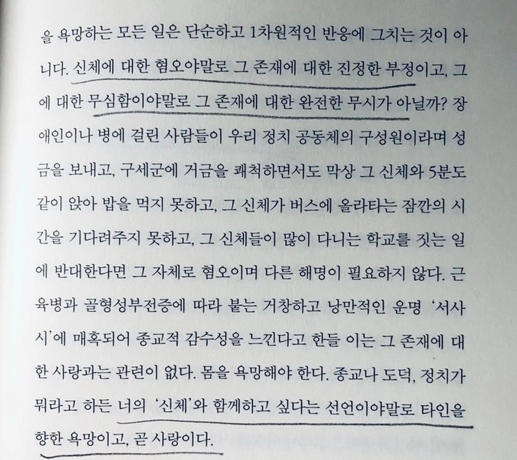 “신체에 대한 혐오야 말로 그 존재에 대한 진정한 부정”(p.267)이라고 이야기한다.