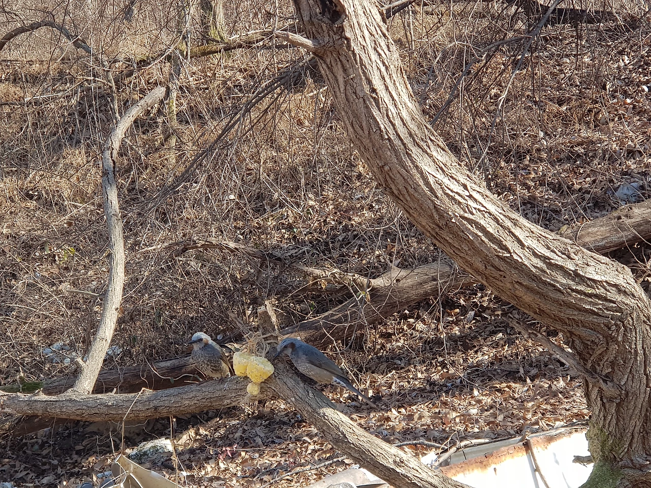 숲길에 들어서자마자 새소리가 요란하다. 내가 아는 직박구리 외에 한두 종의 새소리가 더 들린다. 가까이 다가가 보기로 한다. 잡목이 우거진 나무들 사이로 제법 큰 나무가 마주 보고 있는데 대여섯 마리의 새들이 두 그루의 나무를 오가며 요란하게 지저귄다. 직박구리, 박새, 멧비둘기로 파악되었다. 길에서 숲으로 조금 더 들어가 새들을 관찰하기로 한다. 산새들은 보통 사람이 가까이 가면 나뭇가지 높이 날아가 앉거나 멀리 날아가버리기 마련인데 이 새들은 내가 가까이 다가가도 멀리 가지 않고 잠깐 다른 나무에 앉았다가 다시 큰 나무에 앉았다. 그 이유가 궁금해 더 가까이 다가가 관찰하기로 한다. 아... 자세히 보니 나무에 누런 덩어리가 매달려 있다. 새들이 그 덩어리를 쪼아 먹느라 날아가지 않았던 것이다. 정체불명의 노란 덩어리는 뭘까, 나는 또 궁금해서 덩어리를 만져보기로 한다. 누군가 곡물 덩어리를 뭉쳐 꽁꽁 얼려서 나무에 매달아 둔 것이다. 밥알 등 여러 곡식이 섞인 것 같았다. 재미있는 발상이다. 새들에게 모이를 뿌려주는 것은 보았어도 밥덩이를 얼려 매달아 둔 것은 처음 보았다. 그런데 그 밥덩이를 쪼아 먹는 직박구리 한 마리는 내가 가까이 가도 절대 날아가지 않고 끊임없이 쪼아 먹기를 반복했다. 다른 직박구리들은 한 번 먹고 날아가고 다시 와서 한번 쪼아 먹고 내가 다가가면 날아가곤 했는데 딱 한 마리만 시종일관 밥덩이 옆을 떠나지 않는 것이다. 그만큼 배가 고프거나 자신을 해치지 않는다는 것을 알거나... 암튼 새들도 종에 따라 예민함이 다르다는 것을 짐작할 수 있었다. 박새는 직박구리에 비해 좀 더 예민한 것 같았다. 몸이 재빠르고 내가 다가가면 제일 먼저 날아갔다. 멧비둘기 한 마리는 이미 식사를 마친 건지 밥덩이에 관심이 없는 건지 높은 나뭇가지에 앉아 아래를 내려다보고 있었다. 재미있는 광경이었다.
