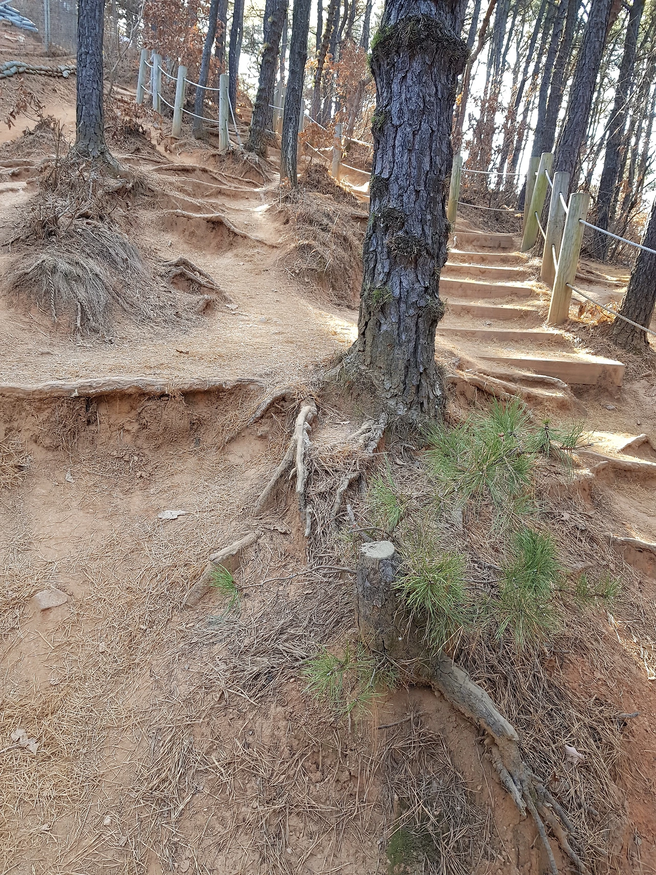오늘은 운정 야당동에서 일산동고등학교 방향으로 걸었다. 이 길 왼편엔 군부대가 있어 철망 울타리가 쳐져있고 오른편엔 무덤들이 드문드문 있는 소나무숲길이다. 몇 년 전에 왔을 때와는 다르게 여러 샛길이 중간중간 나 있었다. 많은 사람들이 이용하는 숲길엔 한 해가 다르게 길이 늘어나기 마련이다. 이 숲길도 여러 갈래길이 나 있었다. '길이 옆에 있습니다'라고 걸어놓은 현수막이 무색할 정도로 현수막 옆으로도 길은 이어졌다. 이 산은 일산과 파주의 경계에 있어 일산 파주 사람이 걸어서 왕래할 수 있는 산이 되겠다. 돌아오는 길에 소나무 그루터기에서 새싹이 나고 있는 모습을 발견했다. 어찌나 사람들이 많이 다니는지 나무들의 뿌리가 내 손등의 정맥들처럼 선명히 드러났고 길들이 봉당처럼 반들반들하다. 드러난 뿌리는 계단이 되어 사람들에게 안전한 길을 만들어주기도 하고, 피곤한 발바닥을 지압하는 용도가 되기도 한다.