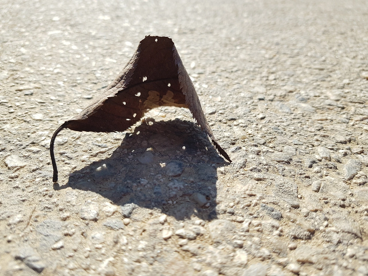 시멘트 포장도로가 끝나는 지점인 산길 입구에서 낙엽 한 장이 바람에 날려 톡톡톡 내 발 앞까지 날아온다. 낙엽이 발이 달린 것은 아니지만 점프를 하듯 날아오는 모습을 보는 것이 재밌다. 멀리서 그 모습을 보면 마치 거미가 멈췄다가 다가오다가 하는 것 같기도 하다. 어렸을 때, 마루로 올라왔던 거미가 그렇게 멈추다 다가오다를 반복했는데 그 순간 낙엽 한 장이 어린 시절 툇마루에서 보았던 거미를 떠올리기에 충분했다. 바람이 멈추면 낙엽도 멈추는데 선명한 그림자가 애니메이션의 유령처럼도 보인다. 수많은 낙엽 더미의 낙엽은 자세히 보지 않지만 낙엽이 한 개 따로 있을 땐 시선이 간다. 그런 나뭇잎이 햇살을 받으면 선명한 그림자를 만드는데 그런 것들은 상상력을 불러오기에 충분하다. 나는 그런 하찮은 것에 상상력을 발동하거나 내가 아는 그 무엇과 닮은 점을 찾아보기도 한다. 이 낙엽은 시멘트 위에서 밟힐까 아님 땅으로 날아가 흙이 될까를 생각해보기도 한다. 낙엽 한 장도 따로 보면 같은 잎이 없다. 그 소멸마저도.