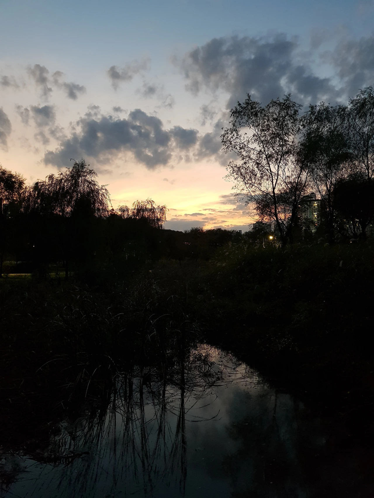 석양이 내린 호수공원에 오리들이 울고 물에 비친 푸른 잿빛 왜가리가 서서히 어둠으로 사라지네.