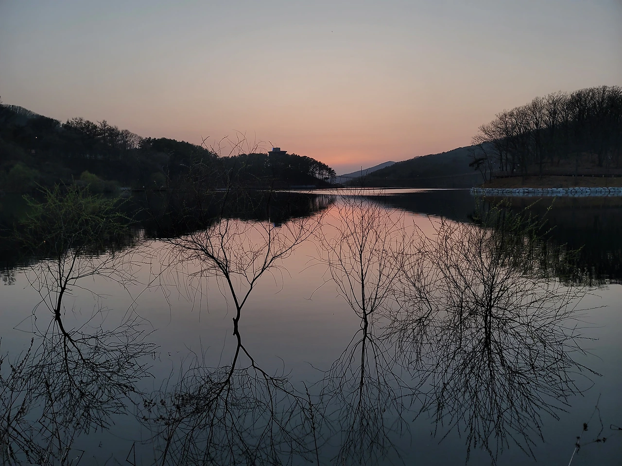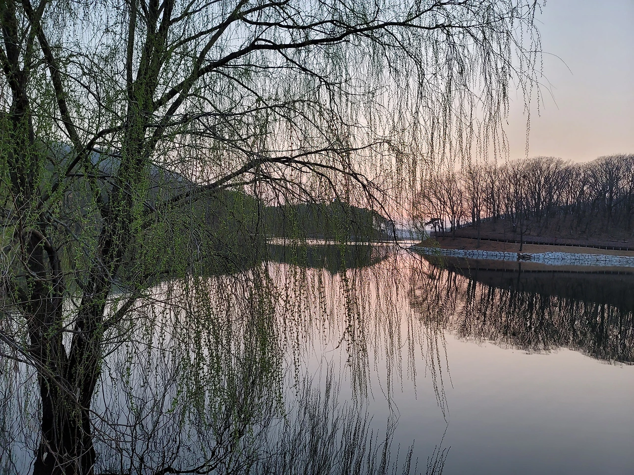 지는 노을, 버드나무, 수면에 비친 버드나무, 이런 것들을 감상하고 사진으로 남기고 어둑해져서 주차장에 돌아왔다.
