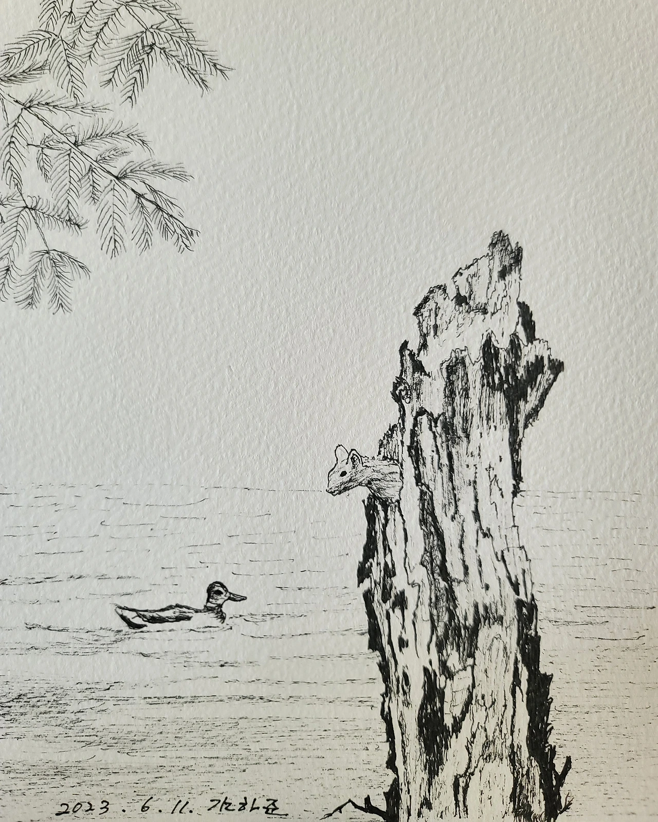 나는 집에 돌아와서도 당시 찍은 영상과 사진을 보고 또 보았다. 결국 펜으로 그림까지 그리게 되었다. 이후, 나는 그곳을 지날 때마다 나무 등걸을 살피는 버릇이 생겼다. 그로부터 두 달 후 나무 구멍 밖으로 삐져나온 푸른 잎사귀를 발견했고 그곳을 산책할 때마다 나무 등걸을 보게 되었다. 그 식물은 하루가 다르게 자라났고 나는 그 후 그 나무 등걸이 다시 살아난 나무로 느껴졌다.