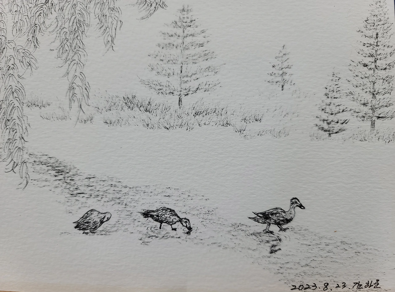 고인 빗물을 들이키는 흰뺨검둥오리를 만났다.