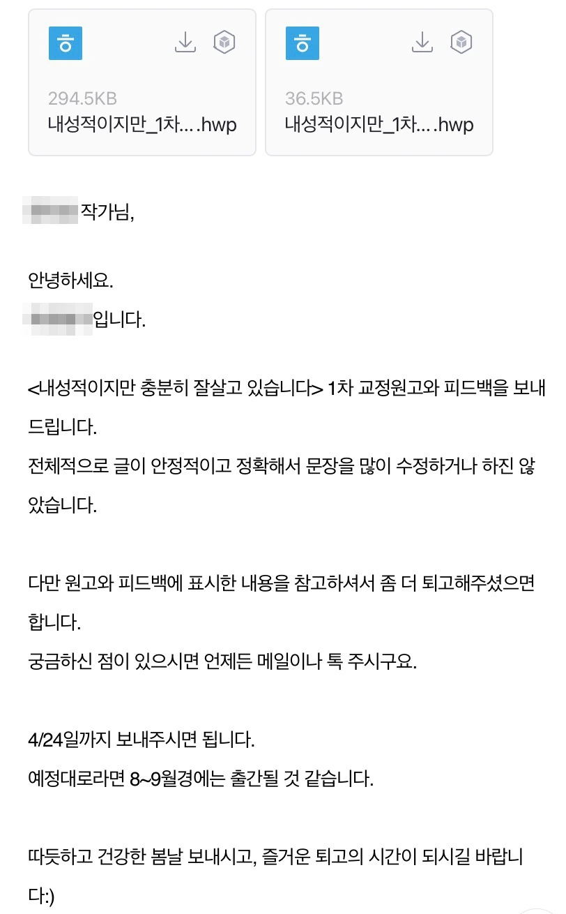 어떤 피드백을 주셨을지 두근거리네요. 교정 원고는 아직 열어보지 않았어요. 기대가 되기도 하고, 어떤 걸 수정, 추가, 삭제를 해야 할지 걱정도 돼서 말이죠. 퇴고는 즐거우면서도 괴로워요. ㅎㅎ