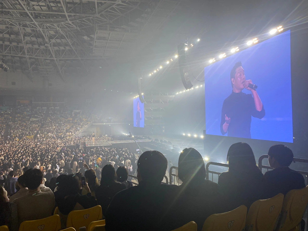 싸이님은 25년 차 가수, 콘서트의 황제답게 첫 곡 시작 전부터 공연장을 장악하셨어요! 관객들이 공연에만 집중하고 즐길 수 있게 프롬프터도 없애시고, 조명도 다시 세팅하시고, 카메라샷과 음향까지 공연에 맞게 지시하시더라고요.