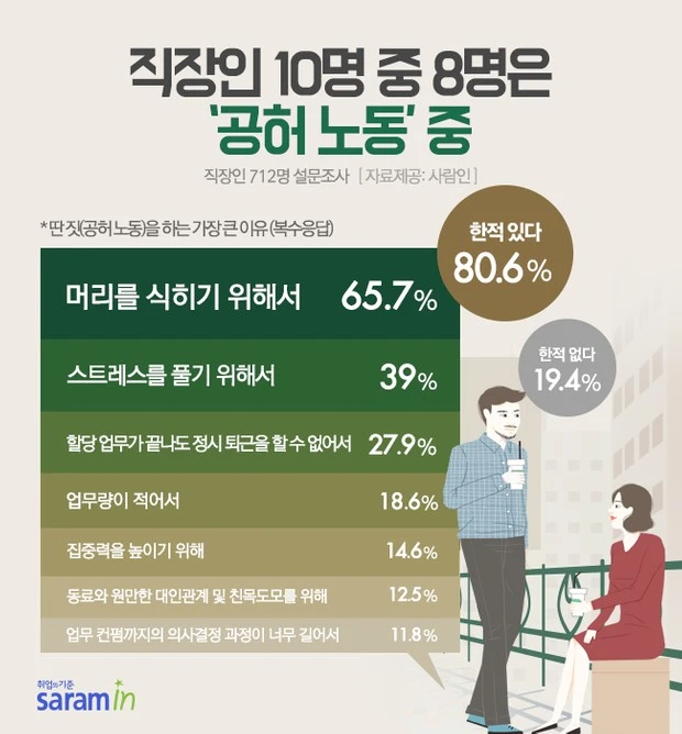 2017년에 사람인이 직장인 712명을 대상으로 한 설문 조사에 따르면 80.6%가 공허노동을 한다고 응답했다. 공허노동을 하는 이유는 머리를 식히기 위해서가 가장 많았고, 스트레스를 풀기 위해, 할당 업무가 끝나도 정시 퇴근을 할 수 없어서, 업무량이 적어서 등의 대답이 뒤를 이었다.