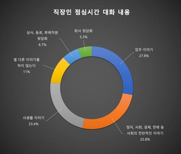 벼룩시장 구인구직이 2016년에 소셜네트워크를 방문한 직장인 553명을 대상으로 직장인들의 점심시간 대화 주제와 관련하여 설문 조사를 진행했다. 그 결과 27.8%가 ‘업무 이야기’를 한다고 응답했다. ‘정치, 사회, 경제, 연예 등 사회의 전반적인 이야기’(25.8%), ‘사생활 이야기’(23.4%), ‘별 다른 이야기를 하지 않는다’(11%), ‘상사, 동료, 후배직원 뒷담화’(6.7%), ‘회사 뒷담화’(5.3%)가 그 뒤를 이었다. 물론 여성과 남성의 응답이 다르긴 하다. 여성 응답자는 ‘사생활 이야기’를 많이 하고, 남성 응답자는 ‘업무 이야기’를 많이 한다고 응답했다.
