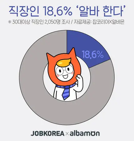 최근에 잡코리아가 알바몬과 함께 30대 이상의 직장인 2,050명을 대상으로 ‘직장인 아르바이트 현황’을 조사했다. 조사 결과 응답자의 18.6%가 ‘현재 직장생활과 병행해 아르바이트를 하고 있다’고 답했다. 이중 30대는 16%, 40대는 19.8%, 50대는 23%로 나이가 많아질수록 알바하는 비율이 높아졌다.
