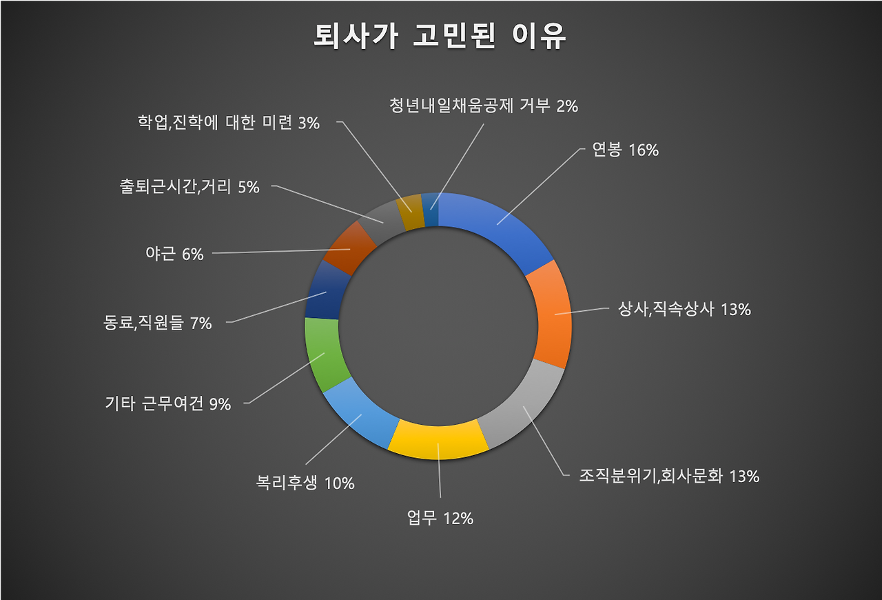 퇴사를 고민한다고 해서 모두가 퇴사하지는 않는다. 위 설문조사에서 25%만이 실제로 퇴사했다고 응답했다. 4명 중 1명만 실제로 퇴사를 한 것이다. 나머지 응답자 중 29%는 직장근무를 이어나간다고 응답했고, 46%는 고민 중이라고 답했다. 직장근무를 이어나가는 29%에게 이 이유를 물었는데, 43%가 ‘경력을 쌓아야 해서’라고 응답했다. 그리고 ‘이직실패’(13%), ‘월급이 필요해서’(7%), ‘동료,직원들’(7%), ‘직장상사’(3%)가 그 뒤를 이었다. 나머지 사람들도 당장 퇴사하고 싶지만, 현실적인 문제로 퇴사하지 못함을 알 수 있다.