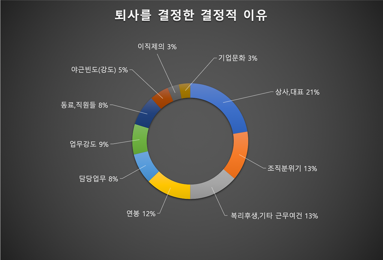 인크루트와 알바콜이 직장인 1,206명을 대상으로 설문조사를 한 결과 10명 중 9명이 회사를 그만두고 싶은 충동을 느낀 적이 있다고 응답했다. 퇴사를 고민한 가장 큰 이유로 ‘연봉’이 꼽혔다. 역시 연봉은 직장생활에 있어서 가장 중요한 부분을 차지하고 있음을 알 수 있다(지난 글 - 연봉보다 중요한 건 없다.). 그렇다면 퇴사를 결정한 결정적인 이유는 무엇일까? 연봉? 아니다. 예상과 달리 연봉은 3위를 차지했다. 그렇다면 1위는? ‘상사,대표’가 꼽혔다. ‘조직 분위기’가 그 뒤를 이었다. 연봉 때문에 퇴사 고민을 하지만, 결국 사람 때문에 퇴사를 결정하게 된다는 사실을 알 수 있다. 퇴사 결정, 직장생활의 어려움은 돈보다는 사람과의 관계에서 발생한다는 것을 알 수 있다.