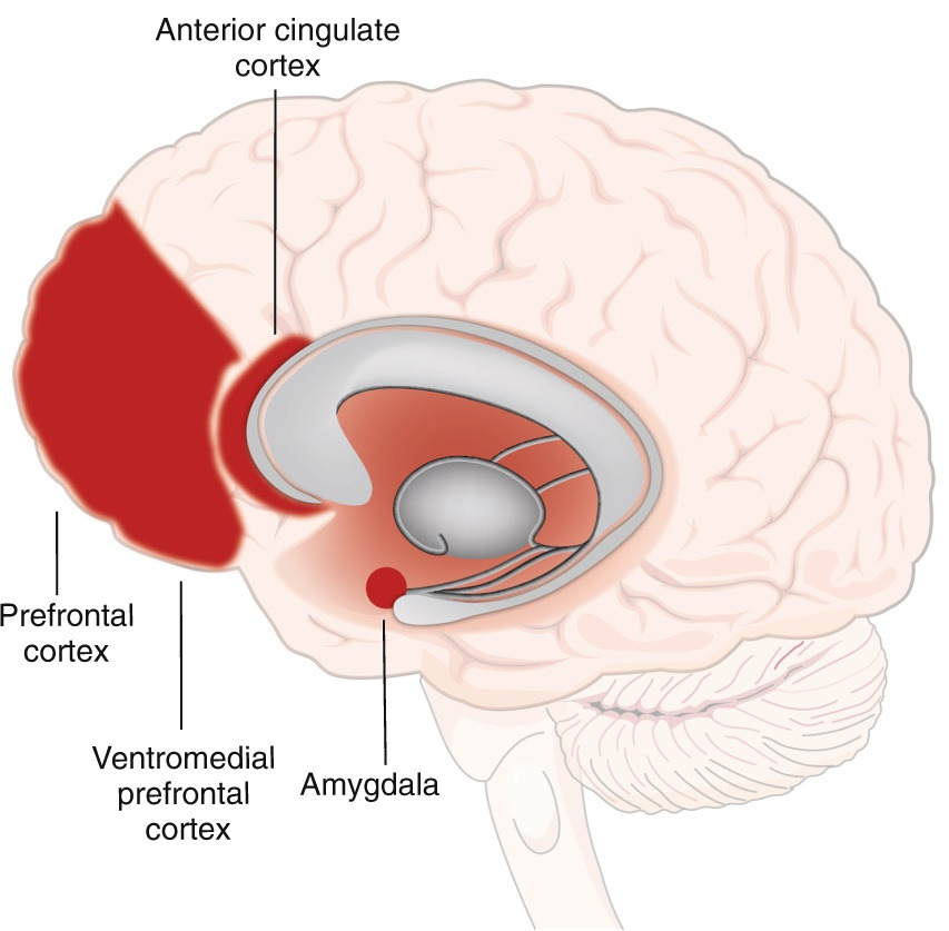 뇌영상 연구에서는 전대상피질(anterior cingulate cortex; ACC)과 전전두엽피질(PFC)이라는 뇌의 두 부위가 인지적 통제에 관여하는 것으로 본다. 전대상피질은 일종의 연기탐지기이고, 전전두엽피질은 소방구조대에 비유할 수 있다. 연기탐지기처럼 전대상피질은 인지적 충돌의 위험을 탐지하기 위한 지속적 모니터링 방식이다. PFC는 사람의 생존본능과 성격 및 계획, 성격 표현, 의사결정, 사회적 행동 조율, 발화와 언어 조율의 다양한 기능을 담당한다. 즉, PFC는 많은 고등 인지적 기능에 책임이 있는 이성의 중심지이다.