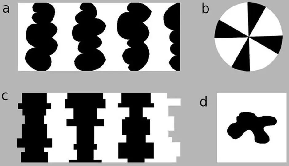 그림 (a)에서 ‘볼록함’의 특성에 따라 검은색 모양은 흰색 배경과 달리 조각별로 볼록한 경계로 제한되기 때문에 전경으로 지각된다. 그림 (b)에서 ‘작은 크기’의 특성에 따라 검은색의 조각은 전경으로 지각되고 흰색의 큰 조각은 배경이 된다. 그림 (c)에서 ‘대칭성’의 특성에 따라 검은색 모양은 대칭성을 이루므로 흰색 배경에 둘러싸인 전경으로 지각된다. 그림 (d)에서 ‘둘러싸임’의 특성에 따라 검은색의 둘러싸인 지역은 전경으로 지각되고, 둘러싸고 있는 흰색 바탕은 배경이다.