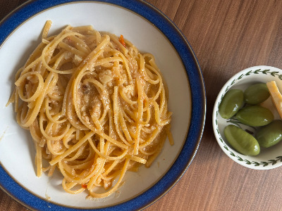 #7. 붉은 점들이 면에 붙었다고 생각되면 불을 끄고 그릇에 담아 완성! 올리브나 치즈 등 먹고 싶은 한입거리를 곁들여도 좋다. 나는 소스 양이 조금 많아 바게트 빵 한 조각까지 추가해서 흡입했다.