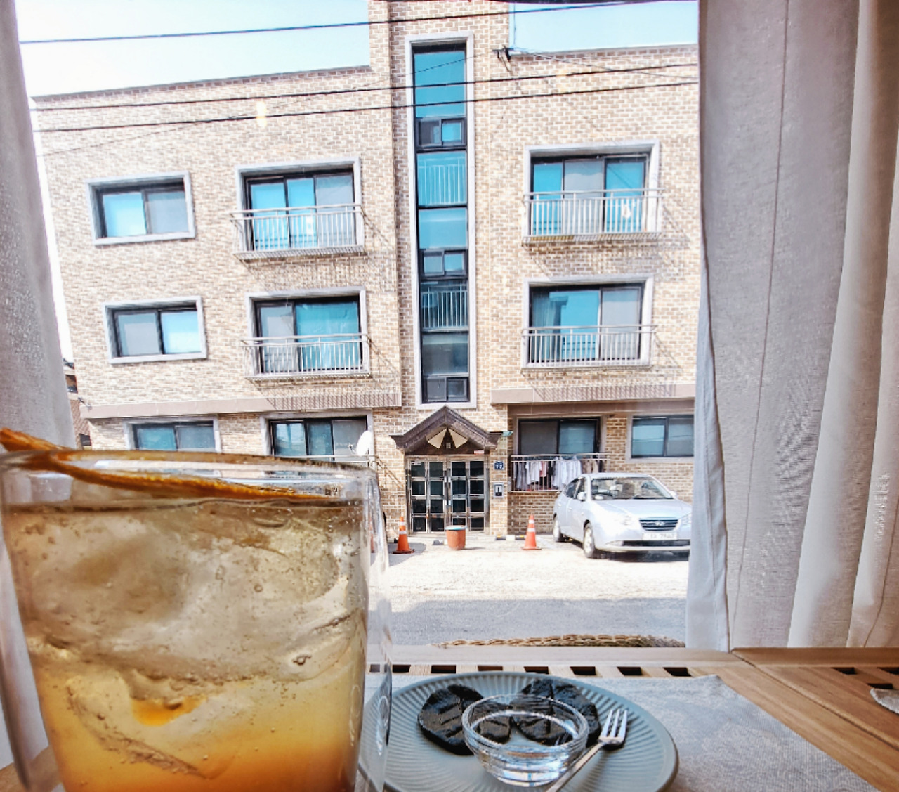 기분 좋게 주문을 마무리하고 자리에 앉는다. 하얀 리넨 커튼이 쳐진 통창으로 밖이 잘 보이는 자리. 라탄 테이블과, 그 색을 맞춘 라탄 의자. 새하얗고 푹신한 방석. 딱, 요즘 유행하는 깔끔하고 따스한 갬성 카페 분위기. 그런데, 그 통창 뷰가 바로 낡은 빌라 뷰이다. 하하. 빨간색 벽돌 빌라의 정문과 마주하고 있다. 그 빌라 안에 서있는 사람이 베란다에 선다면, 적어도 손목시계의 브랜드 정도는 알아맞힐 수 있을만한 거리라 재밌다.