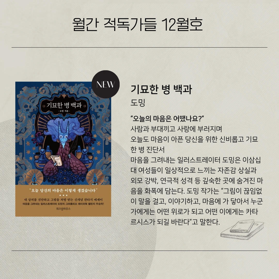 어둡고 마이너한 감성을 ‘위로’라는 키워드로 승화시켜 그라폴리오 페이퍼북 챌린지 우승작으로 선정된 도밍 작가의 『기묘한 병 백과』가 위즈덤하우스에서 출간되었다. 『기묘한 병 백과』는 연재 당시부터 2만여 명의 팬들이 정식 출간해 달라고 요청했지만 단 두 권의 핸드메이드만 제작되어 일러스트 페어나 액정 너머로만 가끔 볼 수 있는 신비한 작품이었다. 2년 만에 책이라는 옷을 입고 정식 출간된 『기묘한 병 백과』는 출간 전부터 천여 명의 팬들이 실물을 보기도 전에 예약 구매하며 기대를 모았다.