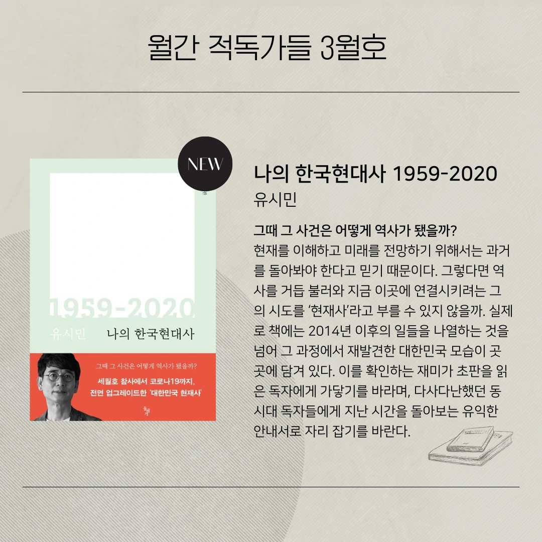 그렇다면 언제나 다시 쓰일 수 있다는 역사의 속성을 책에도 적용해볼 수 있지 않을까? 누가 언제 어떻게 읽고 받아들이느냐에 따라 새로운 의미를 부여받는 것이야말로 책의 세계에서 가장 흔한 일이자 아름다운 일이기 때문이다. 새로운 얼굴로 세상에 나가는 2021년판 『나의 한국현대사』가 어떤 독자를 만나 살아가게 될지 궁금하다.