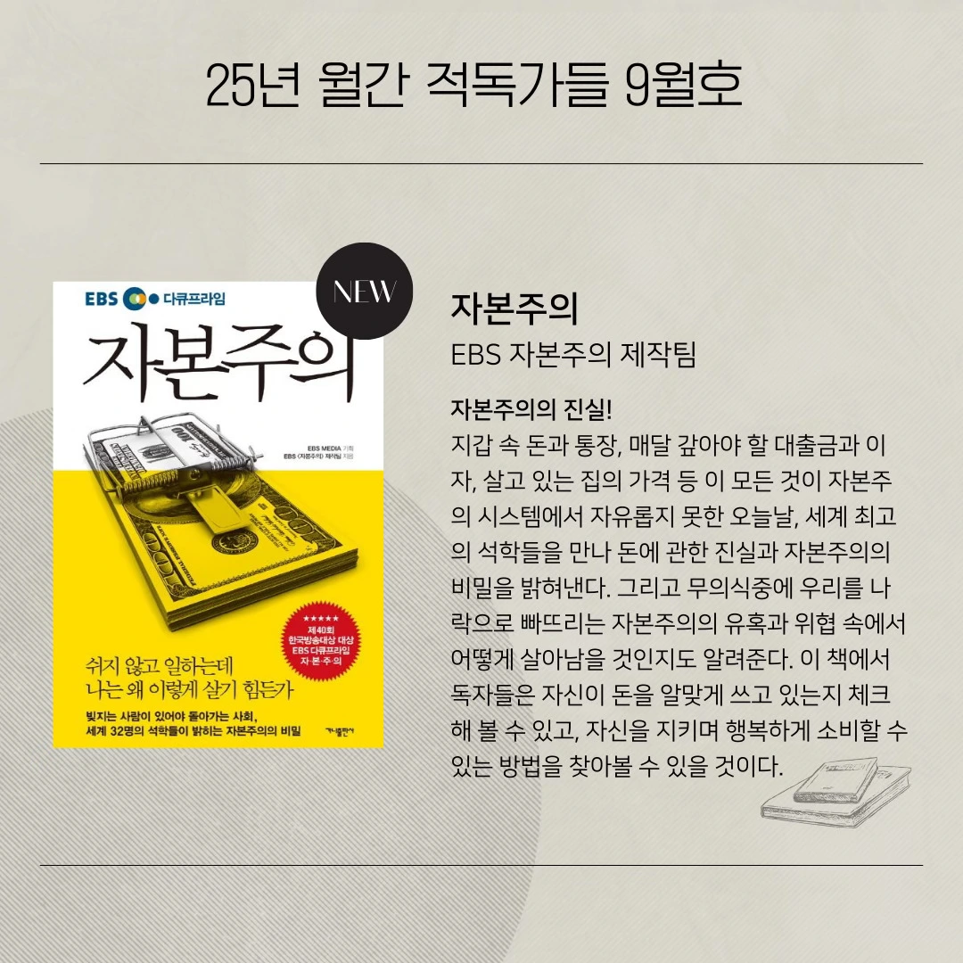 지금 자본주의는 기로에 놓여 있다. 이대로 갈 것인가, 새로운 길을 모색할 것인가. 이매뉴얼 월러스틴 예일대 교수는 2012년 한 강연에서 “자본주의는 한계를 맞았다.”고 말했고, 2012년 당시 산은금융그룹 회장을 맡고 있던 강만수 전 산업은행장은 “현재 위기는 대공황 때보다 더 크고 오래갈 것이다. 자본주의는 끝났다.”고 말한 바 있다. 약 250년에 걸쳐 우리 사회를 지배했으며 현재 위기를 겪고 있는 ‘자본주의’를 쉽게 풀어낸 방송, ‘EBS 다큐프라임 《자본주의》 5부작’이 책으로 출간됐다(가나출판사/388쪽/17,000원). 2013년 한국방송대상 대상을 거머쥐면서 다시 한번 주목받고 있는 ‘EBS 다큐프라임 《자본주의》 5부작’은 사실 한 주부 PD의 사소하면서도 근원적인 물음에서 비롯된 것이었다.
