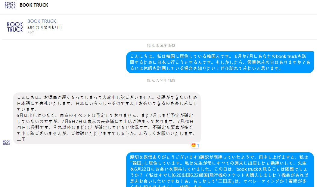 나 : 친절한 답변 감사합니다 :) 번역이 잘못 있던 것 같고, 다시 말씀드리면, 저는 한국에 거주하고 있습니다. 나는 선생님이 항상 모든 주말에 출점했다고 착각하여 선생님을 6 월 22 일에 만날 기대하고 있었습니다. 이날은 book truck보기 어렵습니까? (난 이미 [6.20 출국 6.22 귀국] 비행기 티켓을 구입했습니다) 기회가 된다면 꼭 뵙고 싶네요! 아, 혹시 '미타 점」은 운영합니까? 질문이 많아 죄송하고 감사합니다.