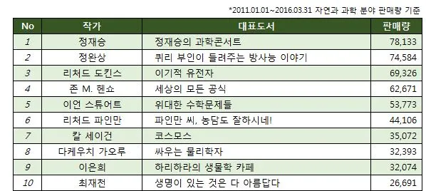 4월 21일은 과학기술의 진흥을 위해 제정된 ’과학의 날’. 이날을 전후로 정부와 과학 관련 기관 및 단체들은 과학기술의 중요성을 일깨우기 위한 다양한 행사를 진행하고 있다. 이에 북DB는 다가오는 과학의 날을 맞아 과학의 대중화에 기여한 작가들을 살펴보았다. 2011년부터 올 3월까지 인터파크도서 ’자연과 과학’ 분야의 도서 판매량을 기준으로 선정한 ’과학 베스트셀러 작가 TOP 10’을 소개한다.