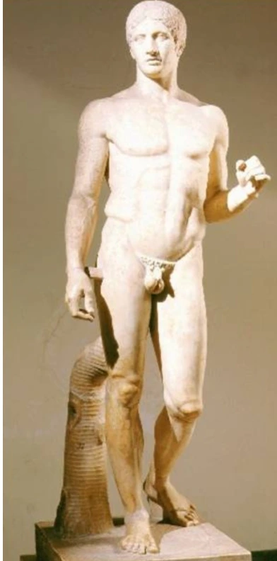 만물 가운데 인간이 가장 아릅답다고 생각한 그리스 사람들은 인체의 이상적인 모습을 표현하려고 했습니다. 이들은 끊임없이 관찰하고 탐구한 결과 가장 아름다운 비율을 찾아냈습니다. 예를 들면 머리와 신체의 비례를 1대 8로 나눌 때에 가장 아름답다고 여겼습니다. 또한 그리스 미술의 중요한 발전 중 하나는 ‘콘트라포스토’ 자세입니다. 이는 신체의 무게 중심을 자연스럽게 표현하는 기법으로, 인간의 자연스러운 동작을 생동감 있게 묘사했습니다. 폴리클레이토스의 '창을 든 사람'은 이러한 비례와 균형을 완벽하게 표현한 대표적인 작품입니다. 그는 조각의 비례를 과학적, 수학적으로 계산하여 인간 신체의 이상적인 비율을 표현하고자 했습니다.