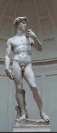 다비드의 표정을 보세요. 다비드는 지금 어떤 생각을 하고 있는 것 같나요? 이 표정은 사람들로 하여금 다양한 해석을 가능하게 합니다. 결투를 앞둔 긴장감, 맞서 싸우려는 결단력, 상대방을 비웃는 듯한 자신감 또한 느껴집니다. 그의 자세와 시선은 정적인 아름다움과 동적인 긴장감을 동시에 표현합니다. 또 다비드의 아름다운 몸의 근육과 신체 비율은 조각 예술의 정점을 보여줍니다. 이것은 미켈란젤로의 철저한 인체 해부학 연구의 결과로 완벽을 추구하는 그의 정신이 고스란히 드러납니다.