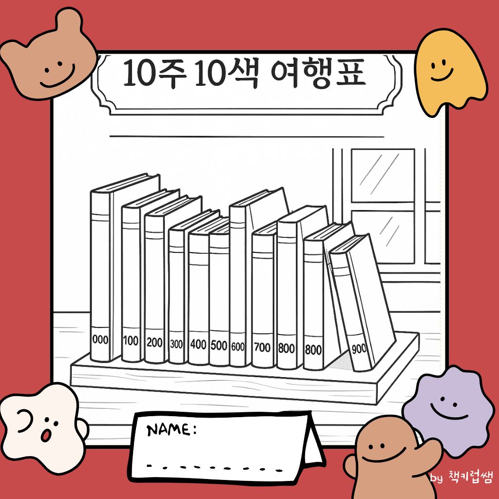 냉장고나 벽에 10칸짜리 표를 그려 놓고, 한 주에 한 칸씩 색칠합니다. 색은 서가 번호 색깔 스티커(예: 000 흰색, 100 빨간색 …)로 정해 두면 아이가 “우리 아직 700번대(예술) 안 갔네!” 하고 스스로 다음 행선지를 제안합니다.