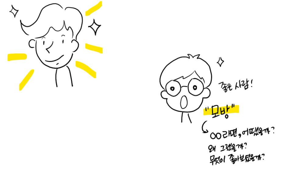 그러던 어느 날, 책을 읽다가 가르쳐주는 곳이 없다면, 스스로 배워야한다는 생각이 들었습니다. 제가 처음 했던 방법은 '모방'이였습니다. 책을 읽으며, 드라마나 영화를 보며, 그리고 사람들을 만나는 과정에서 저 사람처럼 했으면 좋겠다고 떠오르는 것을 그냥 지나치지 않고 시도해보기로 했습니다. 처음에는 물론 그저 따라해보는 방법이였습니다. 겉모습만 처음 따라했는데도 뭔가 괜찮아지는 것 같아서 좋았는데 금새 시들어버린다는 것을 알게 되었습니다. 겉만 따라해서는 결과를 낼 수 없었습니다. 임시방편은 될지 몰라도 방법이 될 수 없는 것이죠. 다른 방법은 없나 고민 중에 모방에도 방법이 있구나라는 점을 느끼게 되었습니다. 왜 했는지, 어떻게 했는지, 무엇을 했는지를 생각하지 않았구나라는 부분을 찾았습니다. 어떻게 하면 제대로 모방을 해볼 수 있을까 생각하니 경험이 많아져야 왜, 어떻게, 무엇을 이라는 것을 익힐 수 있겠다는 생각이 들었습니다.
