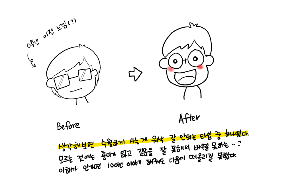 그래서인지 저는 워낙 수월하게 사는 게 워낙 잘 안되는 타입이였습니다. '모르겠다'라고 생각되는 것에는 흥미가 전혀 생기지 않고, 유난히 모르는 것에 대해서 어떤 것을 질문해야 알 수 있는지를 생각해내지못해서(이건 지금도 비슷한 ) 질문을 못하는 성향이였습니다. 유두리있어 보이는 것 같으면서도 오히려 'FM'에 가까웠습니다. 주어진 일이 아닌 것을 하지를 전혀 못했죠. 그리고 해야할 일을 잘 못하면 심장이 두근거릴정도로 완벽주의때문에 괴로운 시간들이 많아졌습니다. 할 수 없는 일에 자꾸 시간을 쓰면서 잘하고 싶다는 생각은 항상 하지만 생각보다 그렇게 하기까지가 힘들었습니다. 자꾸 스스로 지치는 날이 많아지고, 힘들어지는 날이 많아지자 이대로는 안될 것 같았습니다.