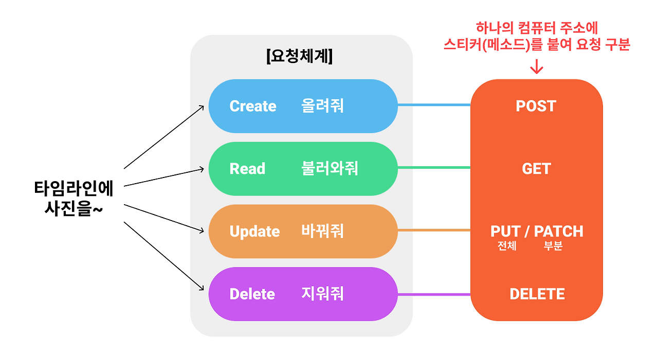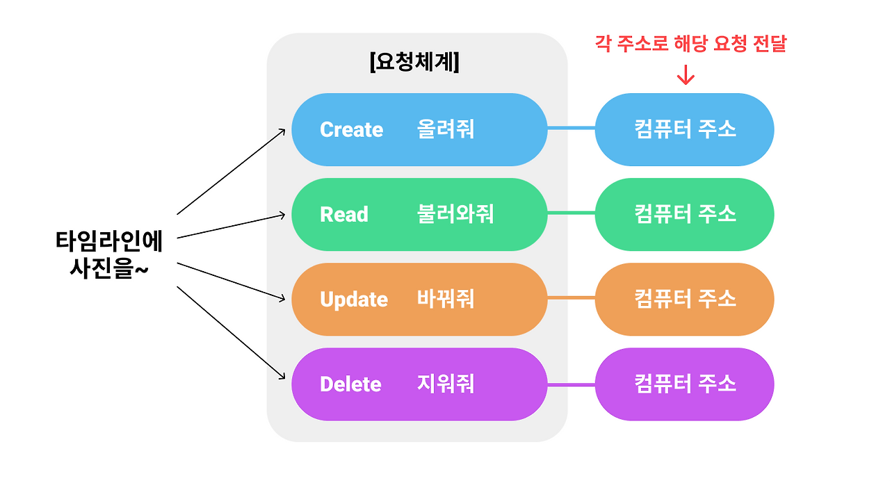 하나의 요청당 CRUD 4개의 주소를 각각 가지고 있다. 그런데 규모가 커질 경우 이렇게 각각의 주소를 가지면 문제가 생긴다. 주소가 너무 많아진다는 점이다. 주소가 많아지면 혹시나 주소가 겹쳐 혼선이 생길 수도 있고 관리하기가 어려워진다. 그래서 답답한 개발자들이 이 문제에 대한 방법을 고민했고, 요청 체계를 더 체계적으로 관리하기 위해 만들어진 것이 RESTful API라고 한다. (참고로 RESTful은 절대 규칙이 아닌 유명한 체계이다.)