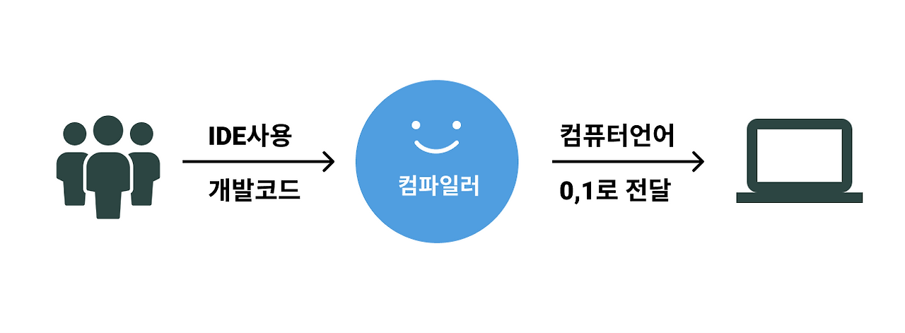 개발자는 컴퓨터로 다양한 서비스를 구현해내는 사람이다. 하지만 컴퓨터는 사람의 말을 못 알아듣는다. 그래서 개발자와 컴퓨터 사이에는 컴퓨터에게 일을 시키는 '컴파일러'가 존재하는데, 개발자가 프로그래밍 언어로 컴파일러에게 문서를 전달하면 컴파일러가 컴퓨터 언어인 0,1로 변환하여 컴퓨터에게 일을 시킨다.