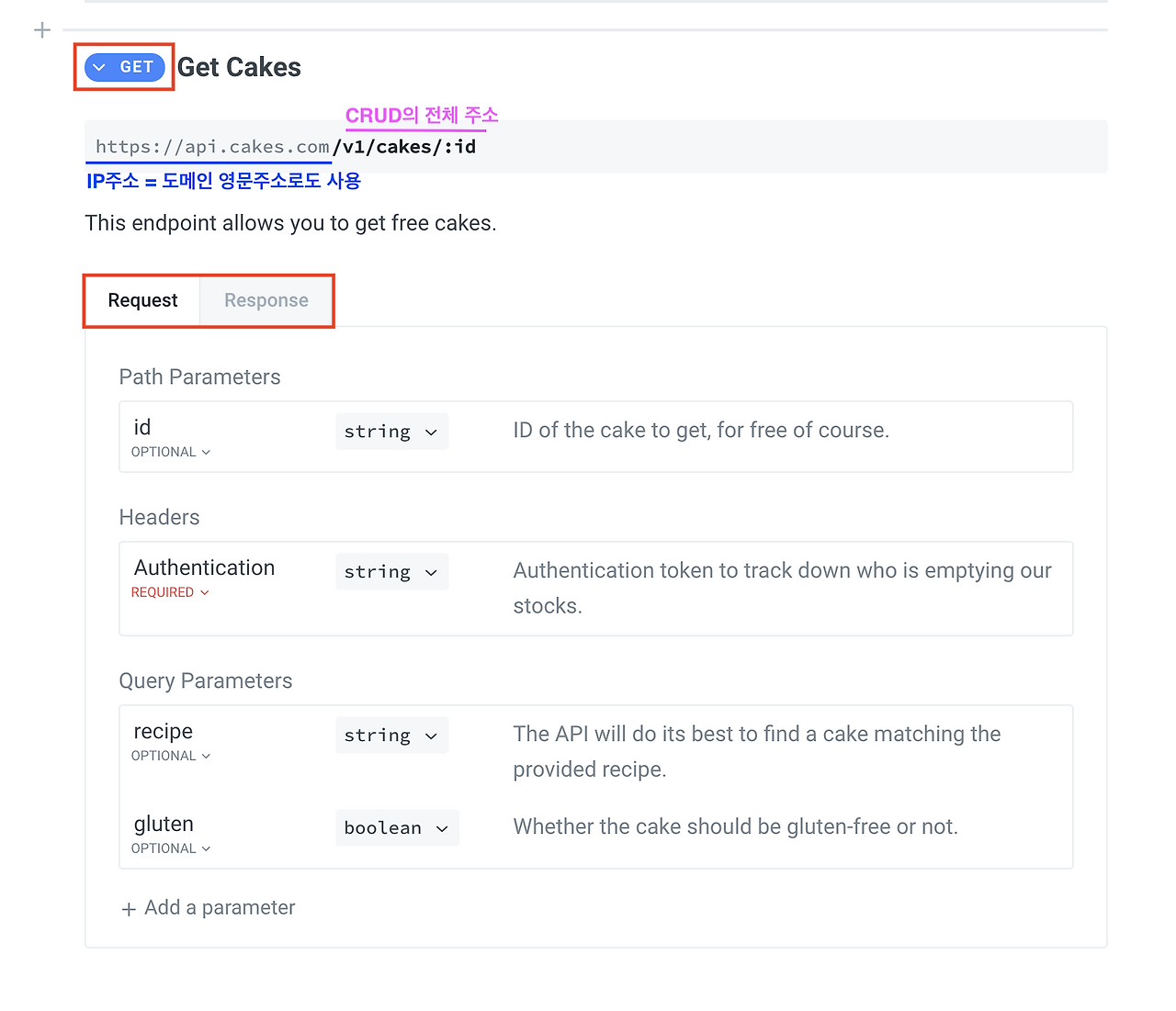 API는 요청/응답을 도와주는 도구라고 했듯 Request, Respense 항목이 있다.