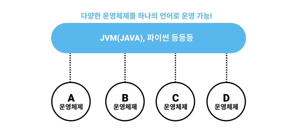 JVM(자바), 파이썬 등의 프로그램이 바로 그것이다..! 저 프로그램들을 깔고 개발을 하면, 하나의 언어로 많은 운영체제 위에서 실행이 가능한 서비스를 만들 수 있다. 단점이라면 운영체제 위에 해당 프로그램을 깔고 거기서 개발을 하기 때문에 좀 느려질 수는 있다고 한다.
