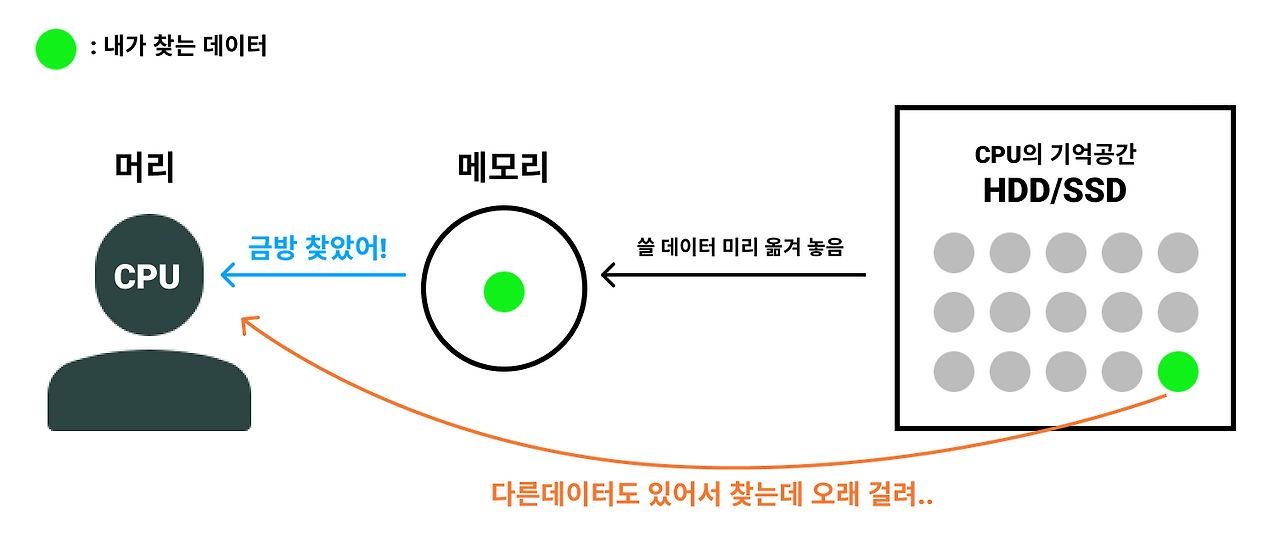 CPU는 컴퓨터의 뇌다. 하지만 기억력은 없다. 그래서 HDD, SSD에 기억을 저장해서 필요한 정보를 그때그때 꺼내 쓴다. 근데 HDD, SSD가 너~~무 넓다 보니 원하는 정보를 찾는 시간이 넘나 오래 걸린다. 그래서 Memory라는 작업공간을 따로 만들어서 필요한 정보 덩어리를 일단 옮긴 후, Memory에서만 작업하기 때문에 훨씬 속도가 빨라지는 것이다. 예로 포토샵을 사용하려고 클릭하면 HDD(SSD)에서 포토샵만 똑 꺼내와서 메모리에 넣어놓고 우리는 그 안에서 메모리랑 소통하며 작업하는 것이다. 깨달았다. 그래서 메모리 용량을 올리면 속도가 좀 더 빠르게 느껴지는 거였군!