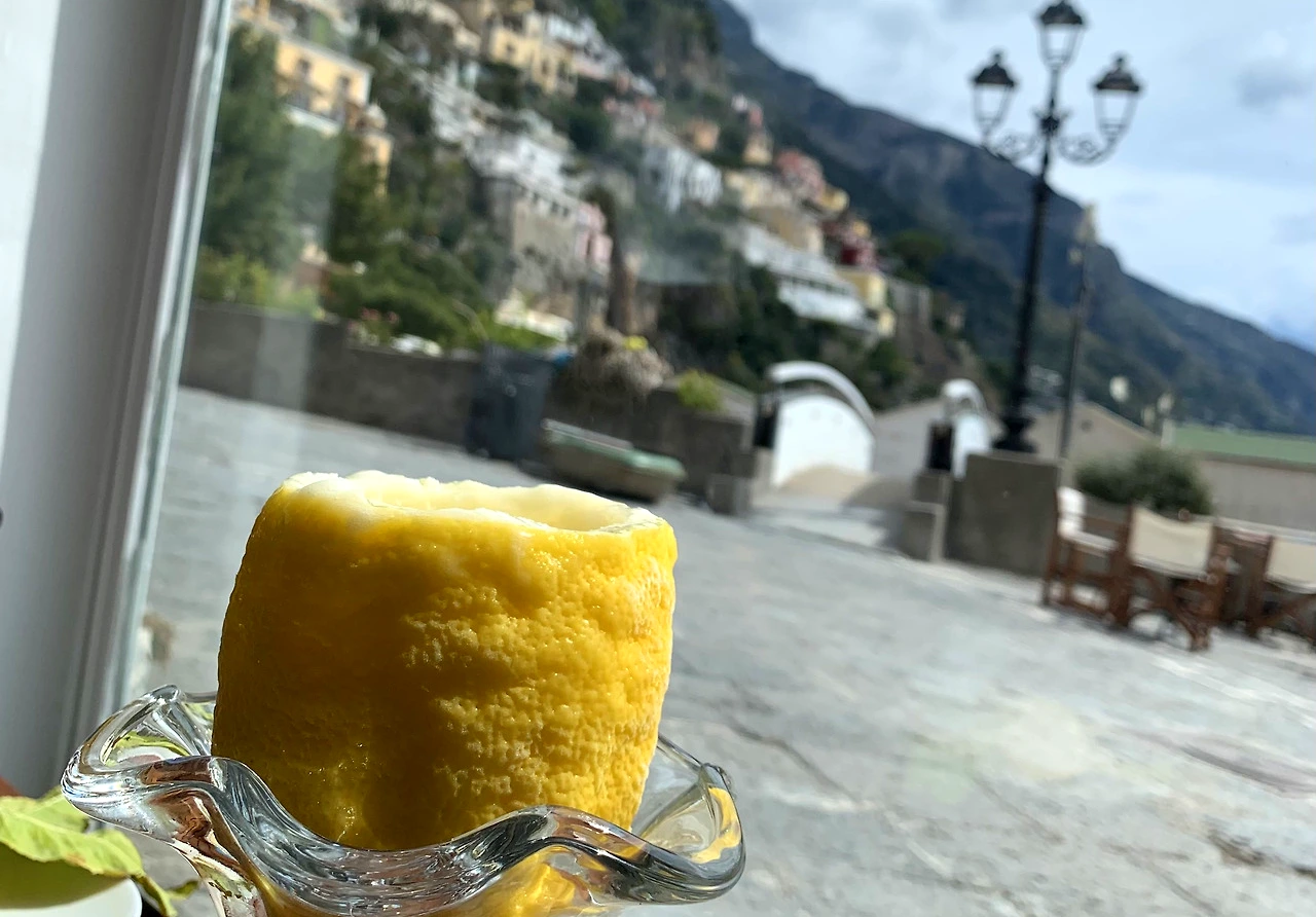 우리는 날아갈 듯한 모자를 붙잡고 펄럭이는 점퍼를 진정시키며 걸은 끝에 해변 오른쪽 구석에 있는 작은 호텔 1층에 위치한 하얗고 예쁜 카페로 입성했다. 주문할 메뉴는 이미 마음속에 정해져 있었다. 레몬이 유명하다는 포지타노에서 먹는 소르베또 리모네(레몬 샤베트). 커다란 레몬 윗부분을 따서 안을 파내고 그걸로 샤베트를 만들어 다시 껍질 속에 채워 내놓는 디저트였다. 생각보다 맛있고 생각보다 시리고 생각보다 훨씬 컸다. 우리는 기분이 좋아져 예쁜 미니 케이크 하나와 에스프레소 한잔도 함께 먹었다. 총 25유로. 호텔 카페라 비쌌지만 더욱 강해진 바람을 피하는 데에는 최상의 안식처였다.