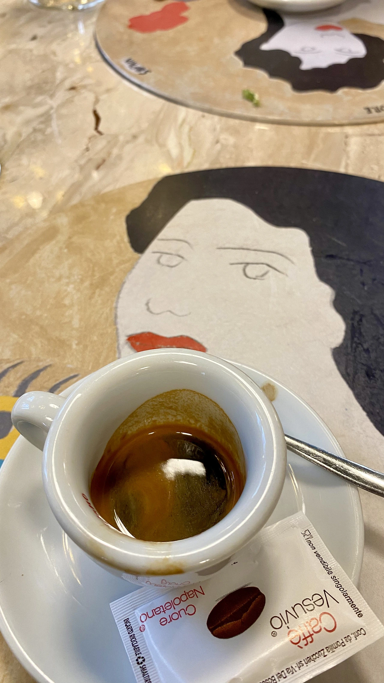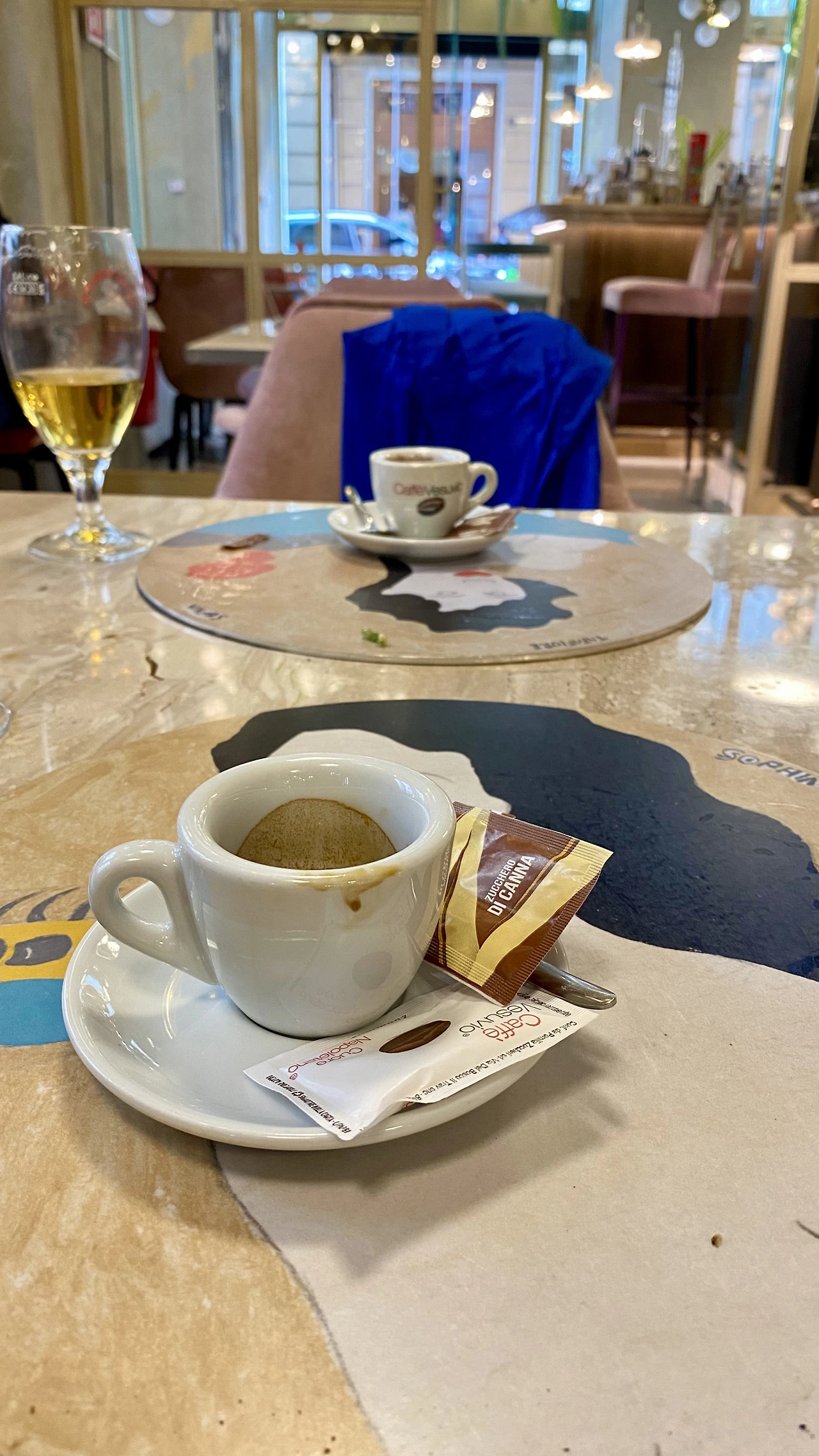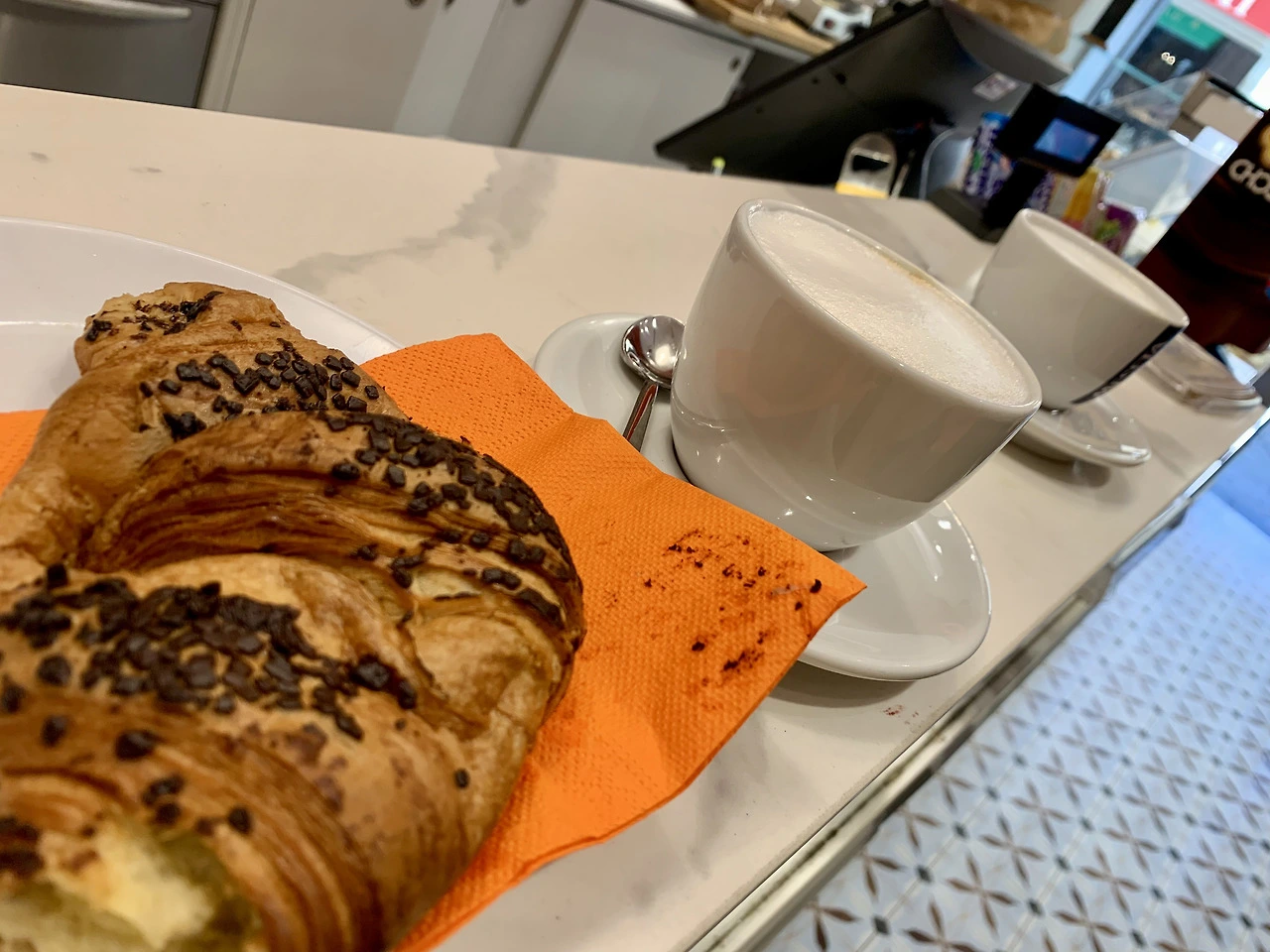 한참을 둘러보고 나서 이제 뭐를 할까 망설이던 그때. 꼬륵- 중년생의 배가 말을 했고, 꼬르륵- 사회의 배가 이어서 대답했다. 절묘한 타이밍에 웃음이 터졌다. 시계를 보니 오전 10시 30분. 여행 와서 항상 아침을 먹다가 거르니 배가 요란한 건 어찌 보면 당연했다. 습관은 정말 무섭다. 적당한 커피 바를 찾아 배를 채우기로 한 사회와 중년생. 그러고 보니 피렌체에 와서는 매일 아침 호텔에서 조식을 먹었기 때문에 바에서 커피와 꼬르네또를 즐긴 적이 한 번도 없었다는 사실이 떠올랐다. 걷다 보니 우리가 자주 가는 젤라또 가게가 보였는데 가만 보니 이 가게, 커피와 빵 류도 파는 곳이었다. 안으로 들어섰다. 항상 밖에서 젤라또만 주문해서 전혀 안을 들여다볼 생각도 못했었는데 생각보다 매장도 넓고 깨끗했다. 테이블에 앉을까 잠시 고민하다가 우리는 그냥 간단히 바에서 먹고 가기로 결정했다. 둘 다 각각 카푸치노 1잔과 꼬르네또 1개를 먹었다(총 7유로). 흰 접시와 흰 우유 거품, 짙은 갈색 꼬르네또와 진한 주황색 냅킨의 색이 선명한 조화를 이뤘다. 무겁지도 가볍지도 않은 만족스러운 아침 식사였다. 맛으로 보나 가격으로 보나.