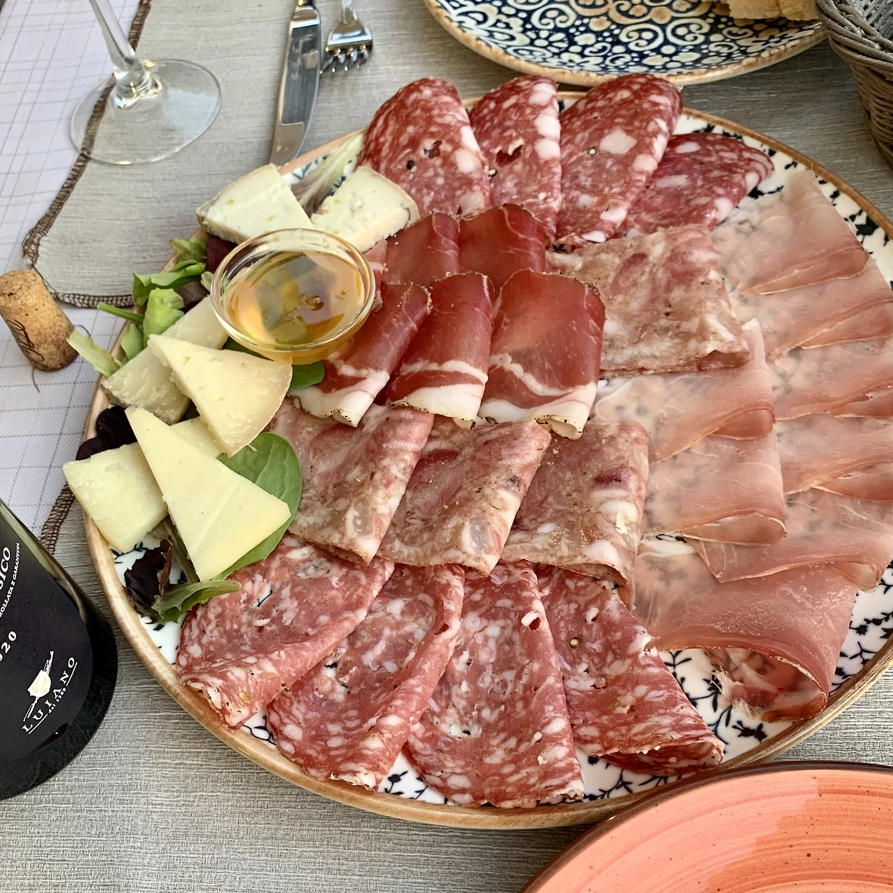 도착한 광장에는 산책 나온 사람들이 적당히 있었다. 상쾌하고 여유로웠다. 저 멀리 건물 뒤로 노을의 기운이 옅게 번져 올라오고 있었다. 광장 주변으로 펼쳐진 음식점들의 야외 테라스 자리가 눈에 들어왔다. “저기 앉자!” 사회가 말했고 중년생도 그 자리가 마음에 들었다. 오스테리아 직원에게 물어보니 밤 9시에 예약이 되어 있어서 식사는 힘들 거라고 했다. 우리도 식사까지는 할 생각이 없었기 때문에 아페리티보(Aperitivo)로 간단히 와인과 탈리에레(Tagliere)는 가능하냐고 다시 물어봤다. 흔쾌히 앉으라고 하는 직원. 우리는 물도 한 병 주문하고 여유롭게 주변 경치를 감상했다. 금세 짙어지는 노을. 자리가 정말 산타 마리아 노벨라 광장 바로 옆이었기 때문에 너무 낭만적이었다. 얼마 지나지 않아 우리가 주문한 하프 보틀 끼안티 클라시코 와인 한 병과 탈리에레 한 접시가 나왔다. 사랑스러운 프로슈토와 치즈, 허브, 꿀까지 완벽한 살루미 탈리에레였다. 여기서 탈리에레(Tagliere)는 이탈리아어로 도마를 뜻하는 단어인데, 쉽게 말해서 햄 치즈 플레이트라고 생각하면 된다. 나무 도마 위에 햄과 치즈, 꿀 등을 보기 좋게 플레이팅 해서 내오기 때문에 도마라는 이름이 붙은 것 같았다. 이탈리아에서는 흔히 탈리에레를 식전에 식욕을 돋우는 프리미 피아띠로 먹는 경우가 많지만, 우리처럼 아페리티보로 와인 안주를 하는 경우도 흔하다. 어떻게 이 정도를 본식이 아닌 애피타이저로 먹을까? 싶을 만큼 넉넉한 양의 탈리에레 한 접시였다. 탈리에레와, 그리고 석양이 물든 성당과, 그 앞의 여유를 머금은 광장까지 곁들인 와인은 누군가 표현한 것처럼 ‘신의 물방울’이 틀림없다는 생각이 들었다. 달콤한 시간이 흘러갔다.