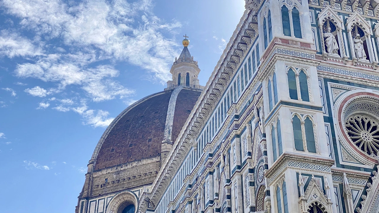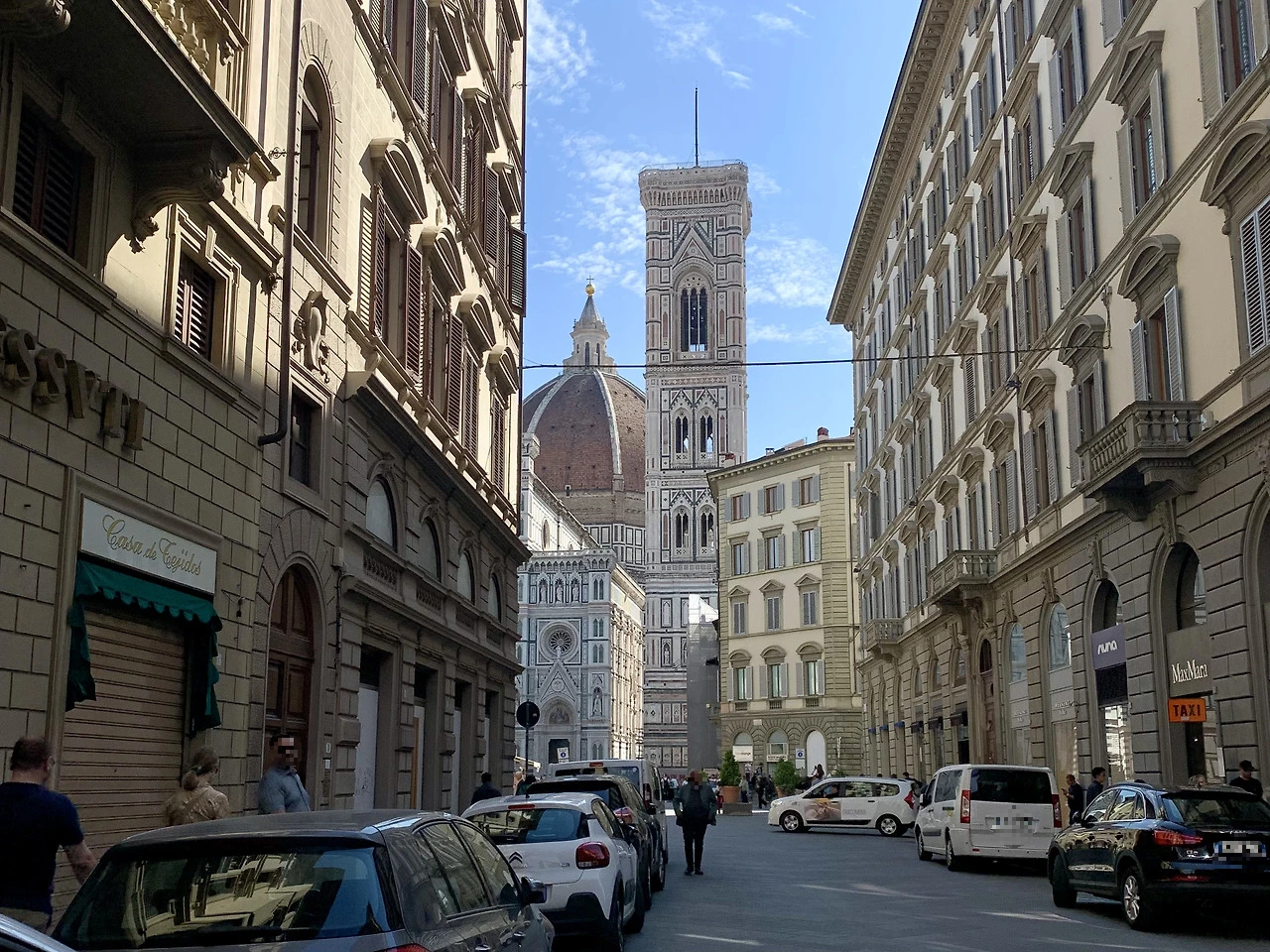 우리는 약속이나 한 듯, 호텔 밖으로 나와 곧장 앞으로 뻗은 아주 작은 골목길을 따라 잠시 걸었다. 1분도(아마도) 안 걸리는 거리를 지나면, 골목이 끝나는 곳에 말도 안 되게 웅장하고 아름다운 피렌체 두오모가 펼쳐진다. 두오모가 나타난다고 표현하기엔 매일 봐도 항상 충격적인 아름다움이 있으므로 펼. 쳐. 진. 다.라고 표현하고 싶었다. 저번에도 언급했었지만 호텔이 두오모 코 앞이었기 때문에 아침에 나오면 두오모를 한 번 둘러보고 가는 것이 피렌체에서의 우리의 루틴이었다. 4월 22일 토요일 오전 10시 경의 두오모의 얼굴도 눈부셨다. 하늘도 맑고 구름도 적당해서 더할 나위 없었다. 언제 봐도 현실감 없는 마치 CG 같은, 아니 그림 같은 자태를 천천히 한 바퀴 훑어봤다. 잘 생기고 예쁜 사람이 지나가면 무심결에 눈길이 가듯, 두오모에게서 눈을 뗄 수 없었다. 토요일이라 그런지 입장을 위해 줄 서있는 관광객들이 더 많아 보였다. 이런 줄은 서도 전혀 아깝지 않다고 사회가 말했다. 완벽하게 맞는 말이라고 중년생은 생각했다. 그러고는 두 사람은 정말 천천히 시내를 걸었다. 어느 정도 여유롭게 걸었냐 하면, 아직 오픈 전인 식당 외벽에 붙은 메뉴판을 정독하고 해석하기도 하고, 하다 못해 길거리 벽에 칠해진 페인트의 색깔이나 돌바닥의 작은 균열의 원인이 무엇일까를 가지고 대화를 할 정도였다. 한 마디로, 어떤 일정이 정해져 있는 사람이라면 도저히 할 수 없는 형태의 산책이었다. 걷고 있지만 피곤이 쌓이지 않을 정도로 느린 힐링산책이었다.