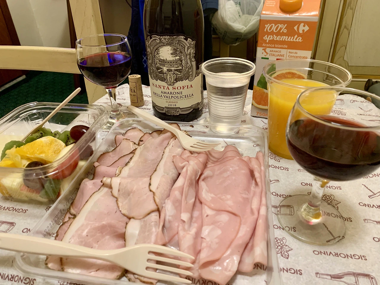 이제 말하지 않아도 아시겠지만, 피렌체에서 하루의 마무리는 와인이었다. 레드 와인의 맛에 눈을 떴다고 해야 할까. 와인샵에 들러 한 병을 포장했다. 오늘의 선택은 아마로네. 한 병씩 마셔 본 3대 와인 중 사회의 입에 가장 맞는 것이 아마로네였기에 결정했고, 대신 이번엔 다른 생산자 것을 골랐다(39.9유로). 돌아오는 길에 마트에 들러 안주 겸 저녁장을 보는 것도 이젠 자동이었다. 겉면을 살짝 구운 프로슈토(Prosciutto Arrosto)와 볼로냐 산 소시지인 모르타델라(Mortadella), 그리고 약간의 과일과 음료수를 사서(16.84유로) 휘파람을 불며 호텔로 돌아왔다.