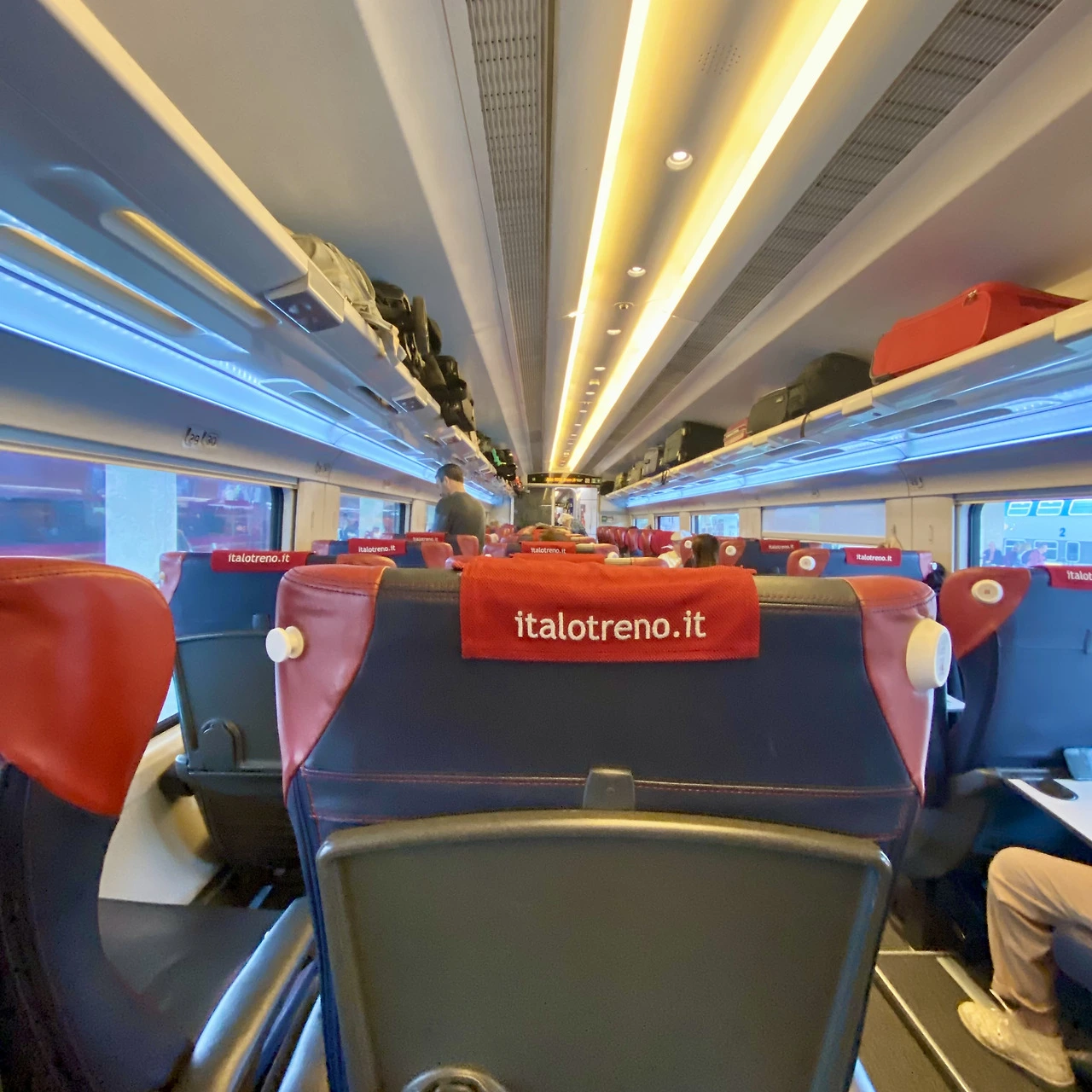 우리가 예매한 기차는 피렌체 산타마리아 노벨라 역에서 11:28분 출발하여 13:05분에 로마 테르미니 역에 도착 예정인 이딸로(Italo) Prima(프리마) 등급 열차였다.(2인 79.80유로) 시간 상으로 여유가 충분했기 때문에 천천히 짐을 꾸리고는 우리가 묵었던 방안을 눈에 담기 위해 꼼꼼히 돌아보았다. 그리고도 뭔가 남은 아쉬움에 사진까지 몇 장 찍고는 방문을 나섰다. 묵직한 310호 열쇠를 반납하면서 시티 택스(City tax)로 84유로를 지불하고는 캐리어를 끌고 지상층으로 내려가는 엘리베이터에 올랐다. 띵- 문이 열리고 호텔 밖으로 나온 사회와 중년생. 마지막으로 피렌체 두오모에게 인사를 하러 갔다. 너네가 가든지 말든지 전혀 상관없다는 듯, 쾌청한 하늘 아래 두오모는 여전히 잘 생기고 예쁜 얼굴을 도도하게 뽐내고 있었다. 마음속으로 두오모에게 작별의 인사를 던진 사회와 중년생은 이제는 제법 익숙해진 골목길을 걸어 기차역에 당도했고 곧바로 플랫폼으로 들어갔다. 우리가 구입한 표의 탑승구 위치에는 사람들이 거의 없어 한산했다. ‘1시간 반 정도면 가는데 그냥 일반석 살 걸 그랬나?’ 중년생은 속으로 잠시 후회했지만 고개를 돌려 일반석 쪽 탑승구 위치에 사람들이 상당히 붐비는 모습을 확인하자 안도의 한숨을 내쉬었다. (몇 번 얘기한 적이 있지만 중년생은 평소 안전에 조심성이 많은 편이다. 그래서 혹시나 캐리어를 분실하거나 소매치기당할까 봐 기차는 돈이 좀 들더라도 짐칸이 여유로운 좌석을 구매한다.) 그리고 얼마 후 우리가 탑승할 기차가 서서히 플랫폼으로 들어왔다.