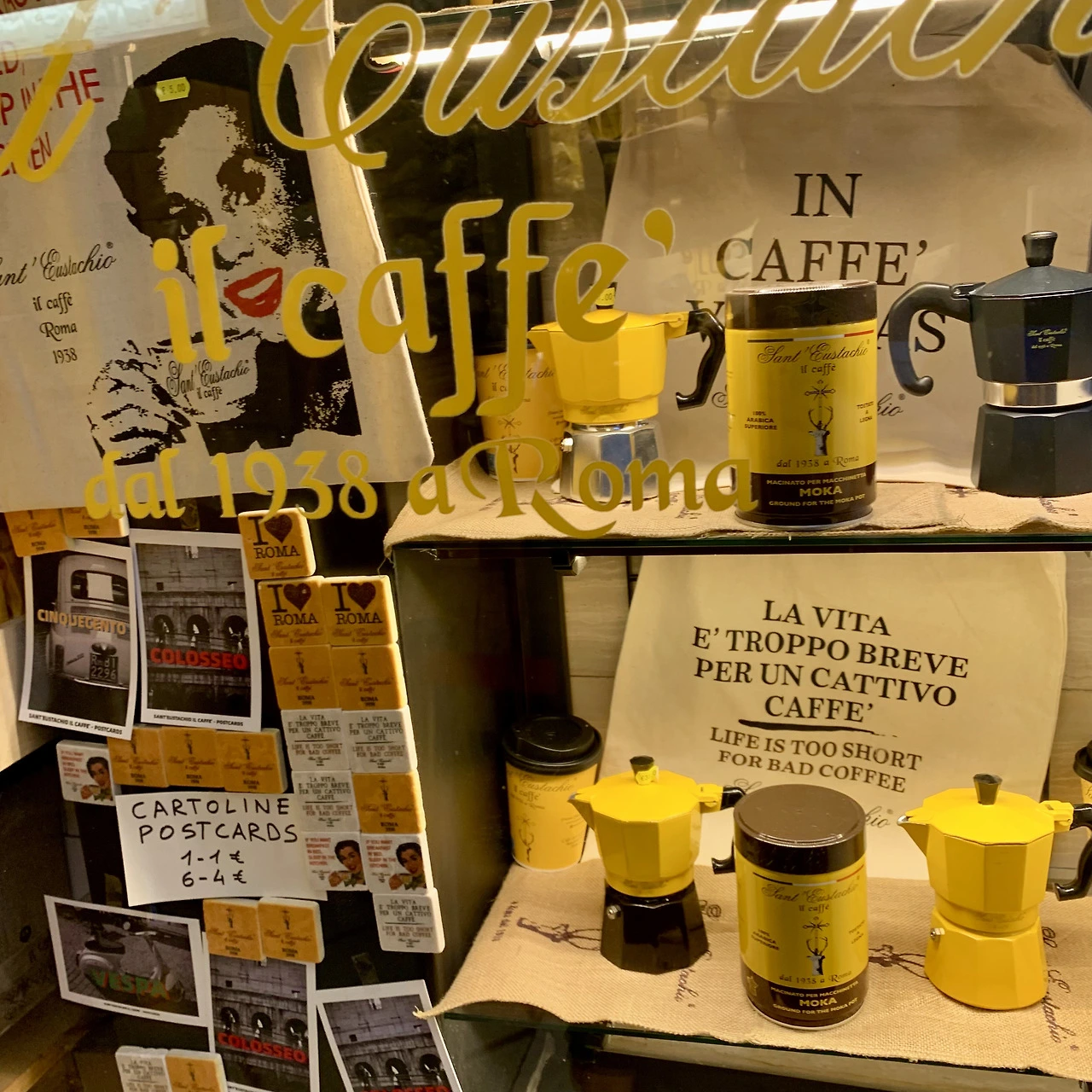 살짝 서늘함이 느껴져서 올려다본 하늘의 해는 아까와는 다르게 옅어져 있었다. 밤의 기운이 서서히 차오르고 있었다. “커피?”, “응, 커피!” 이때 생각나는 건 역시, 따뜻한 커피 한 잔이었다. 처음 떠오르는 건 타짜도로 커피. 하지만 판테온의 북동쪽에 자리한 그곳은 지난번에 가봤으니 오늘은 다른 곳을 가보기로 했다. 판테온의 남서쪽이라고 까지는 말할 수 없는, 서쪽에서 아주아주 살짝 남쪽에 위치한 산 에우스타키오 커피(Sant Eustachio il caffe). 타짜도로만큼이나 유명한 카페로 ‘로마 3대 커피’를 논할 때 단골로 등장하는 곳이었다. 야외 테이블에 앉을까 바에 서서 간단히 마실까로 살짝 의논한 우리는 서늘하지고 있는 야외보다는 바를 선택했다. 커피는 이곳의 시그니쳐인 Gran Caffe 2잔(총 6.8유로). 큰 컵에 든 에스프레소에 기본적으로 설탕이 들어가 있는 커피인데 어떻게 만들었는지 약간 크리미 해서 다른 곳과는 전혀 다른 풍미가 느껴졌다. 노란색이 이곳의 메인 컬러인지 판매용으로 진열되어 있는 모카 포트나 커피 잔, 원두 포장지가 모두 노란색이었다. 우리나라에도 들어와 있어서 얼핏 본 기억이 났다. 그때는 전혀 관심을 가지지 않았었는데 직접 현지에 와서 만나니 모르고 살기엔 너무 매력적인 브랜드였다. 역시 세상은 아는 만큼 보인다. 이 말은 진리였다.