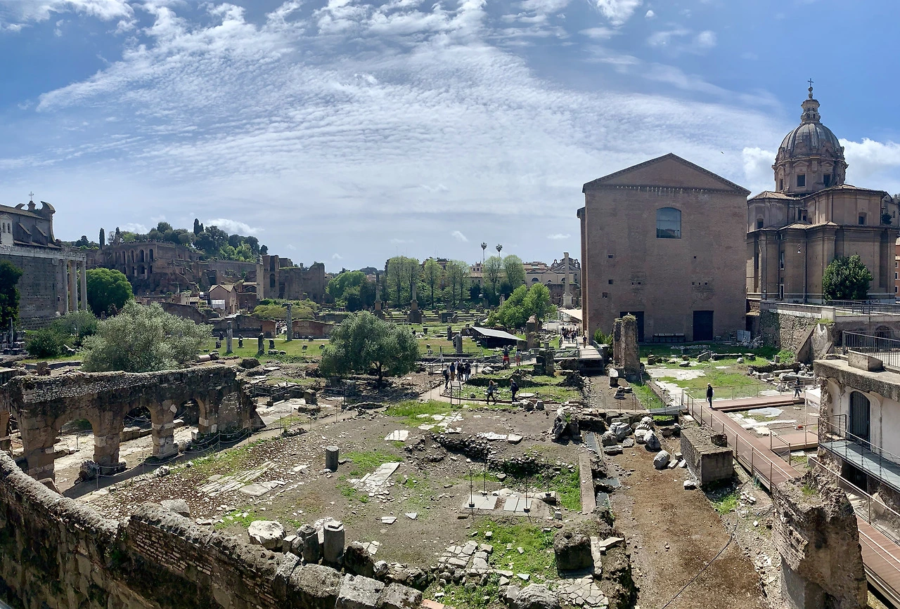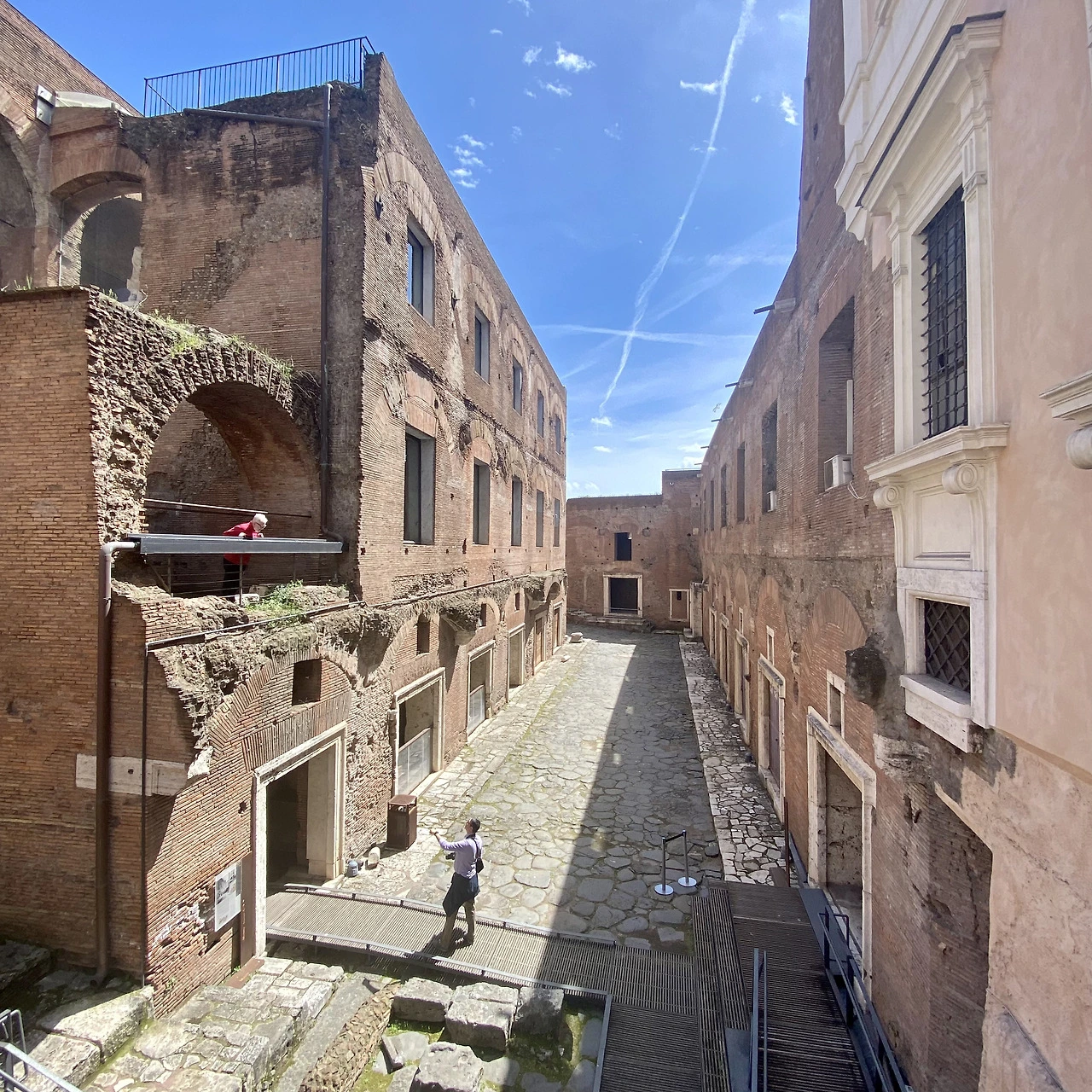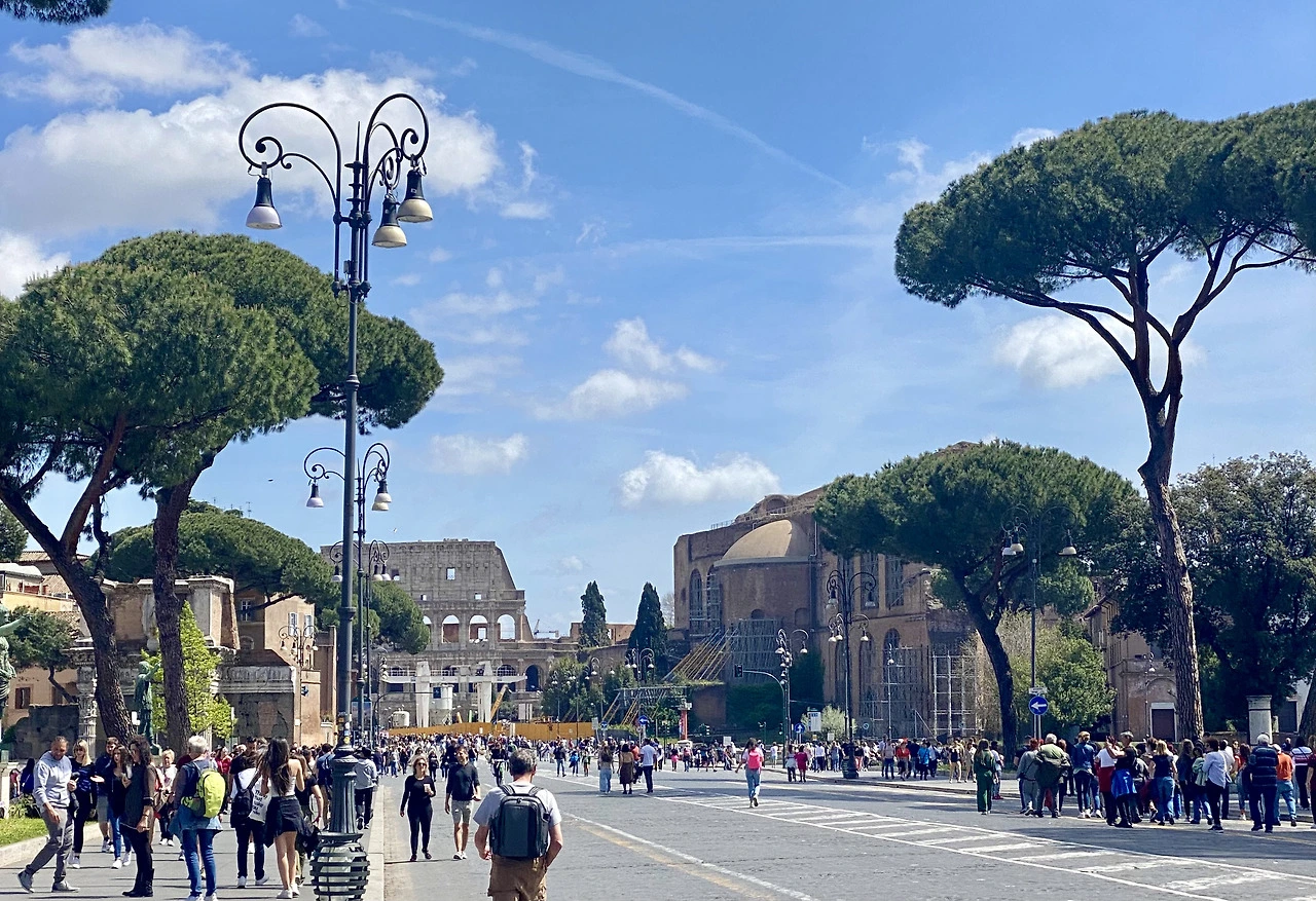 우리를 태운 열차는 티켓에 표시된 도착 예정 시간에 거의 맞춰 로마 테르미니(Roma Termini) 역에 멈춰 섰다. 밖으로 나오니 탁 트인 광장에는 막 도착한 사람들과 곧 떠나는 사람들이 한데 엉켜 바글바글했다. 문득 처음 테르미니 역에 도착했던 날의 밤이 떠올랐다. 그때는 정말 어둡고 낯설어서 호텔로 가는 길이 무섭기까지 했었는데 이제는 사람 구경까지 할 여유가 생겼다니. 감개가 무량할 정도까지는 아니어도 스스로가 아주 살짝 대견해지는 중년생이었다. 캐리어를 끌고 걷기엔 만만치 않은 돌바닥이었지만 처음이 아니라 마음이 준비된 상태여서인지 좀 더 수월했다. 레푸블리카 광장(Piazza della Repubblica)을 지나 나지오날레 대로(Via Nazionale)로 내려가자 금방 우리의 숙소가 나타났다. 며칠 있어봤던 동네라고 지도는 딱히 필요 없었다. 더구나 이 호텔은 우리가 20일 전, 로마에 있었을 때 직접 위치를 확인하고 예약을 한 곳이기에 더 쉽게 찾을 수 있었다. 도착한 시각은 오후 1시 30분가량. 본인의 이름을 ‘사라(Sarah)’라고 밝힌 로비의 직원이 밝은 미소와 함께 친절하게 맞아주었다. 체크인 시간은 오후 3시부터여서 우리는 짐부터 맡긴 뒤, 한 바퀴 산책을 하고 돌아오기로 했다. 목적지는 서로 말하지 않아도 알고 있었다. 지난번 로마에 있었을 때 사회와 중년생이 가장 좋아했던 Via dei Fori Imperiali로 발걸음이 자연스레 향하고 있었다. 베네치아 광장에서 콜로세움까지 직선으로 쭉 뻗은 도로인데 양쪽으로 가득한 유적지 사이를 꿰뚫는 낭만적인 코스라서 로마에 돌아오면 매일 가자고 했었다.