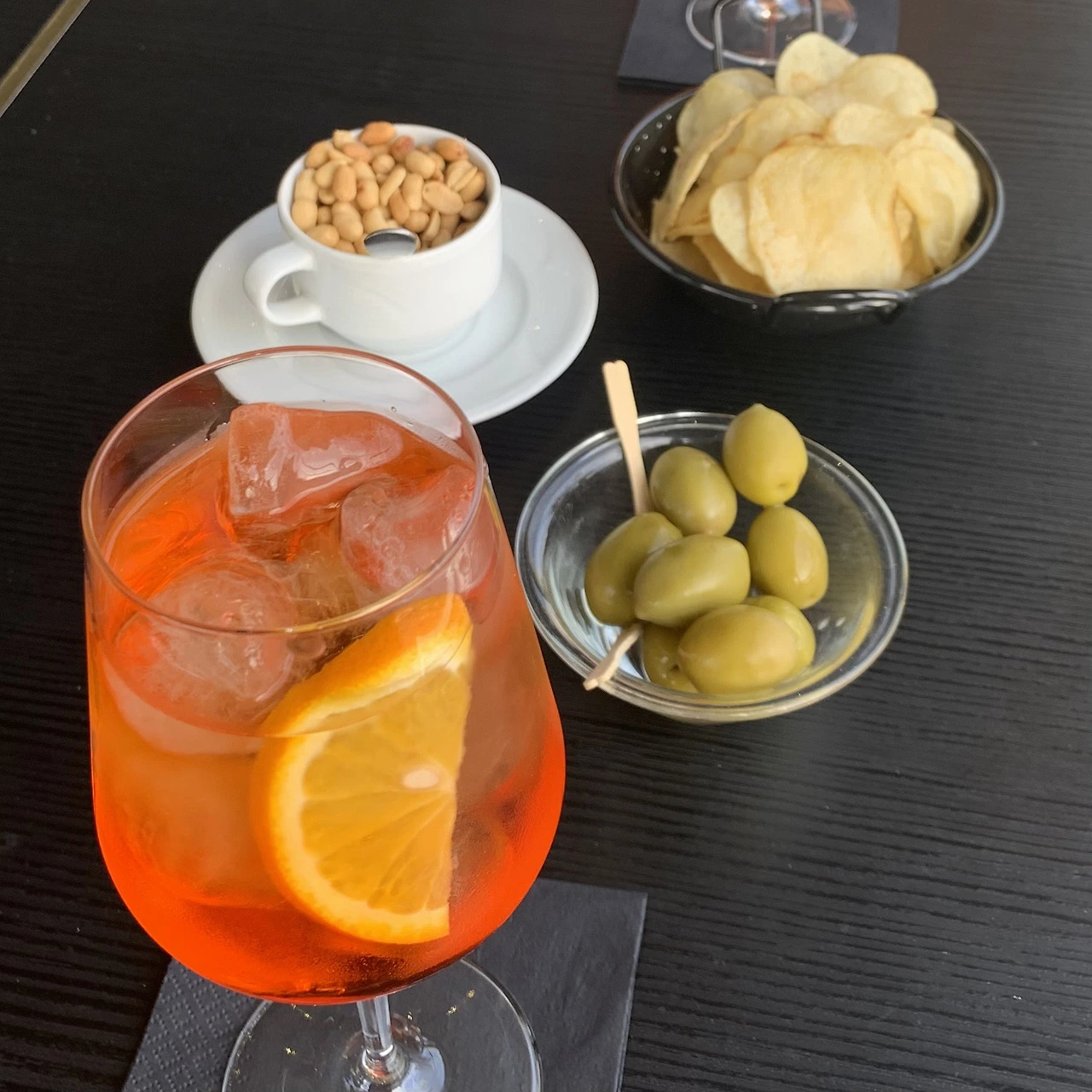 애매한 시간이어서 그런지 몰라도 사람은 거의 없었다. 2~3 테이블 정도가 차 있었는데 모두 서양 관광객으로 보였다. 아페리티보 시간이어서 우리도 스프리츠 아페롤로 2잔을 주문했다. 곧이어 스프리츠 두 잔이 올리브와 감자칩, 땅콩과 함께 제공되었다. 천막이 쳐 있었지만 내리쬐는 강렬한 태양이 안까지 뚫고 들어와 눈이 부셨다. 자연스레 선글라스에 손이 갔다. 그러고는 마셔 보는 스프리츠 첫 모금. “아~~ 너무 좋다!” 중년생의 속마음과 똑같은 말을 사회가 입 밖으로 내뱉었다. 도시를 이동하는 날이기에 평소보다 다소 지치고 긴장했던 오후를 나른하게 이완시켜 주는 한 모금이었다. 중년생 손가락의 다음 행선지는 먹음직스럽게 올리브가 담긴 유리 접시였다. 작은 나무 포크로 올리브를 막 찍어 올리던 그때였다. “아페리티보에 올리브를 줬었나?” 사회의 순수한 질문에 중년생도 지난 25일 간을 떠올려 봤지만 기억나지 않았다. 지금까지 두 사람이 경험한 아페리티보에 제공되는 간단한 안주(?)는 대부분이 감자칩 약간이나 땅콩 약간이었던 것 같다는 생각이 들었다. 아니면 스프리츠 안에 올리브 한 개가 넣어져 나온 정도? 물론, 사회와 중년생은 둘 다 아페리티보에 관한 지식은커녕, 단어조차도 이탈리아에 와서 처음 접한 초짜들이기에 어떤 구성이 일반적인 것인지 이 당시에는 알 턱이 없었다. (나중에 알아보니 아페리티보는 식사 시간 전에 술이나 음료와 함께 간단한 음식을 곁들이는 이탈리아의 고유한 문화로, 지역 마다도 조금씩 다르고 함께 제공되는 음식도 간단한 감자칩부터 뷔페 수준에 이르기까지 다양하다고 한다.)
