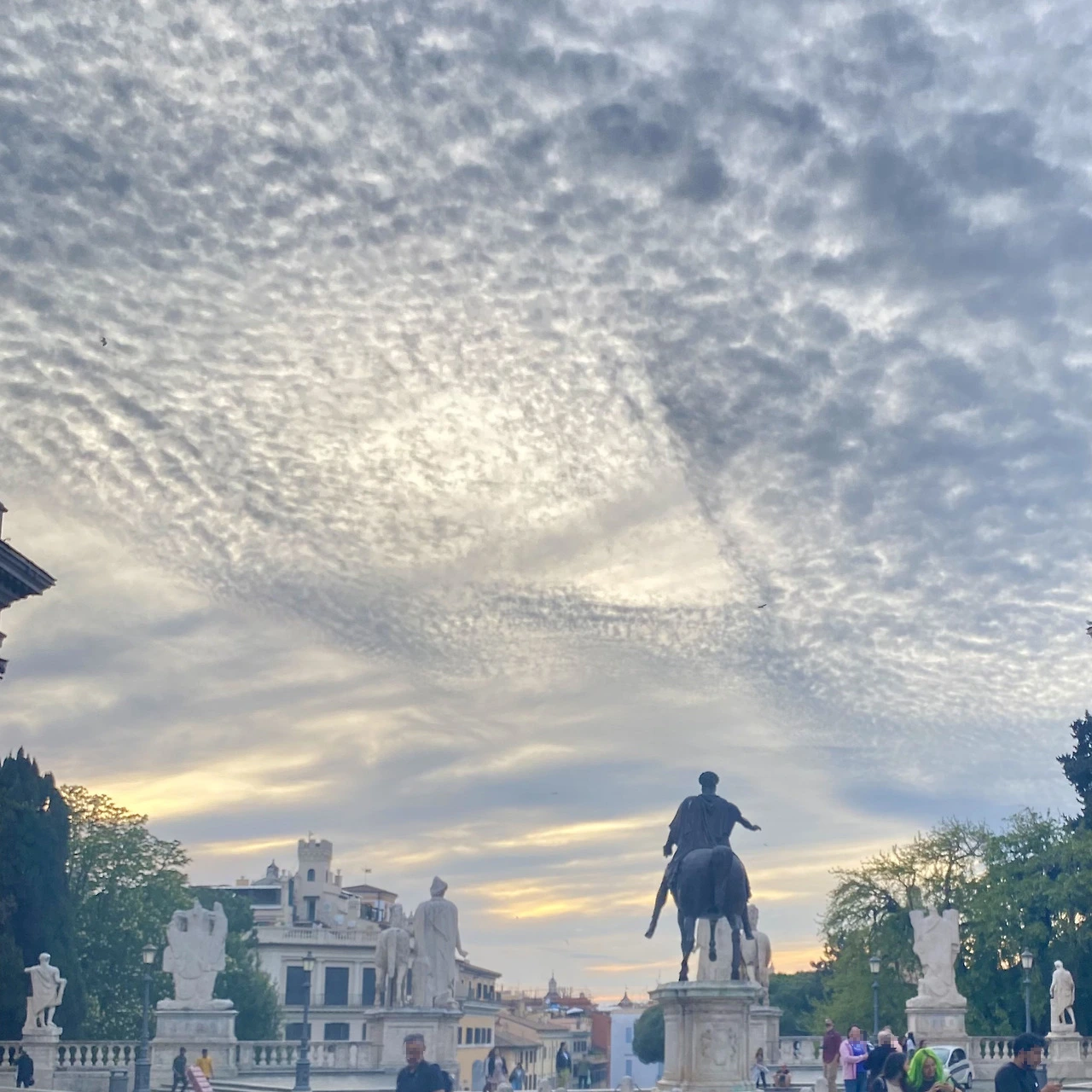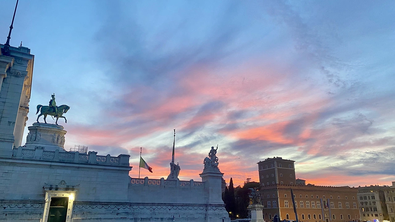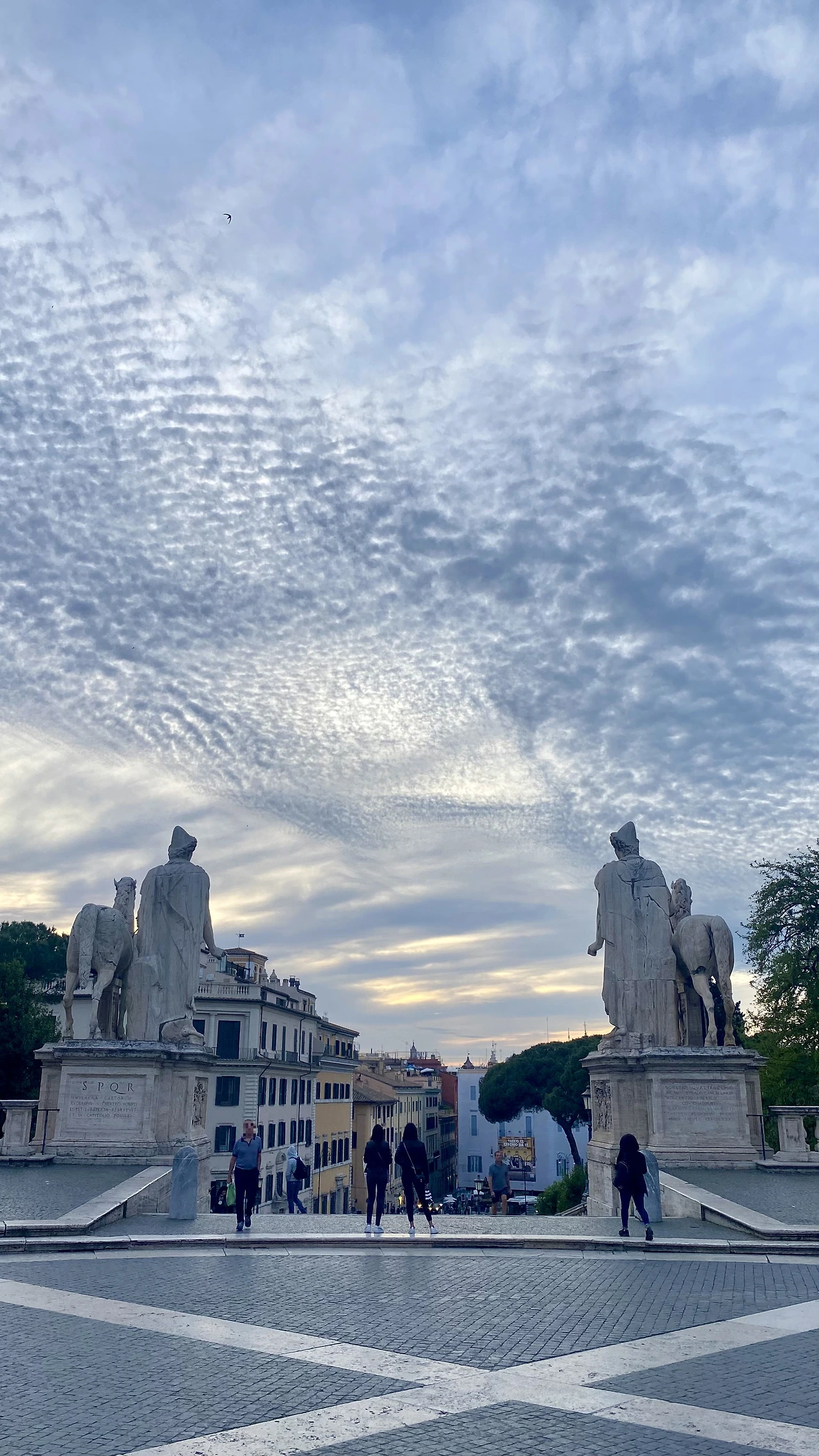7시 40분이 넘어서고 하늘에 희미한 밤의 기운이 스며들기 시작했을 때였다. “우리 임페리알리 거리는 가봤으니까 캄피돌리오(Campidoglio) 언덕에 가보면 어때?” 중년생이 제안을 했다. 이 언덕은 여행 초반, 포로 로마노 투어 중 가이드가 손가락으로 가리키며 “저 언덕에서 야경 보시면 정말 좋아요!”라고 한 말에 이끌려 가려고 시도했으나, 엉뚱한 곳에 가는 바람에(그 덕분에 천국의 계단을 알게 되었지만/ 5화_ 로마의 화요일은 휴일 편 참조) 오르지 못했던 곳이었다. 흔쾌히 동의하는 사회와 함께 중년생은 신중하게 지도를 거듭 확인하며 조심스레 발걸음을 옮겼다. 돌고 돌아 드디어 20여 일만에 제대로 도착한 언덕 정상은 아름다운 구름 아래 한적하고 낭만적인 분위기를 한껏 내뿜고 있었다. 정상에서 한 가지 본의 아니게 미안한(?) 일이 있었는데, 목적지에 도착한 기쁨에 손을 잡고 신나게 흔들며 걷는 사회와 중년생의 팔 사이를 비집고 한 아이가 뛰어 지나가다가 벌어진 상황이었다. 장난을 치고 싶었던 것 같은데, 너무 빠르게 돌진해 오는 바람에 우리의 팔에 감겨있던 스마트폰에 머리를 부딪혔다. 하지만 태연하게 그냥 지나가며 씩씩하게 웃는 아이. 분명 거의 주먹에 맞은 정도의 충격이 있었을 텐데 전혀 아픈 내색이 없었다. 오히려 우리가 당황해서 어쩔 줄 모르는데 그냥 그 길로 신나게 뛰어서 어디론가 사라져 버렸다. 이 글을 볼리는 없겠지만, 이 시간을 빌어 심심한 위로의 말을 전하는 바이다.(혹은 안 났니? 미처 못 봐서 미안했다ㅠ)