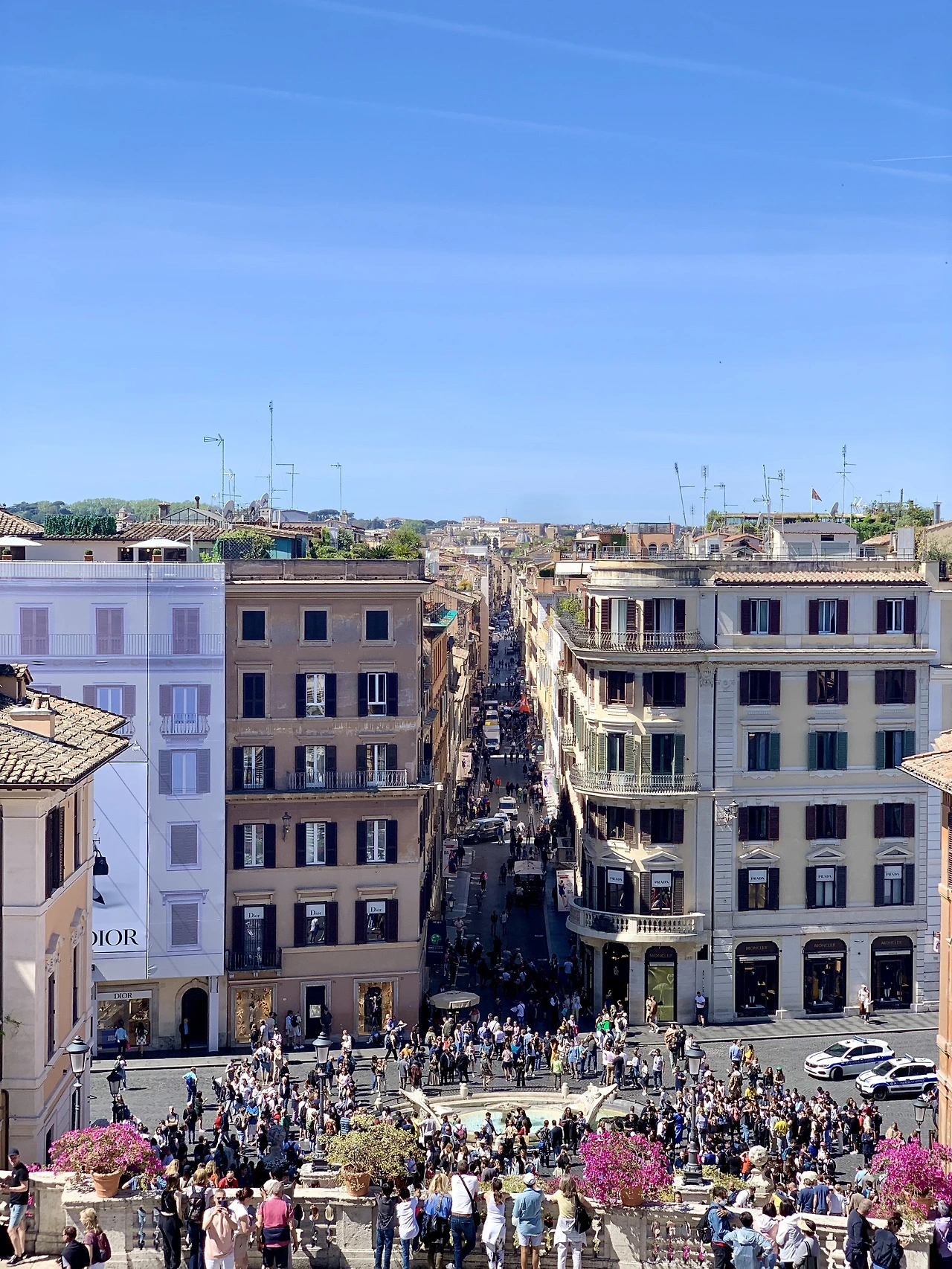 계단은 4월 초에 왔을 때와 마찬가지로 사람들이 가득했고, 그때와는 다르게 짙은 분홍색 꽃이 만발해 있었다. 그냥 지나쳐 가려다가 햇살을 머금은 꽃이 너무 아름답게 피어 있어서 잠시 콧바람을 쐬듯 아주 천천히 계단을 하나씩 내려갔다.