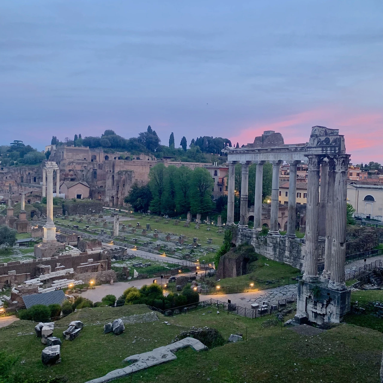 시간은 어느덧 8시. 우리는 언덕 뒤편으로 내려가는 길 쪽으로 이동해서 포로 로마노의 야경을 감상하기로 했다. 역시 경치 명당이어서인지 그쪽에는 사람들이 제법 몰려있었다. 우리도 한 자리 차지하고 유적지를 가만히 내려다보았다. 점점 지는 노을과 켜지는 불빛. 눈앞에 고스란히 펼쳐지는 찬란했던, 그러나 지금은 흔적만 남은 역사의 현장. 비현실적인 낭만의 끝이 우리의 발걸음을 오랫동안 강하게 붙잡았다. 얼마나 머물렀을까? 정확한 시간은 기억나지 않지만 한참을 감상하고 내려오니 웨딩 케이크 위로도 멋진 노을이 휘날리고 있었다. 그러다가 갑자기 하늘 전체로 확 번지는 밤의 기운. 우리의 팔과 다리에는 어느덧 쌀쌀함이 찾아와 슬그머니 달라붙어 있었다. 파르르 몸이 떨렸다. 이제는 호텔로 돌아갈 시간이었다.