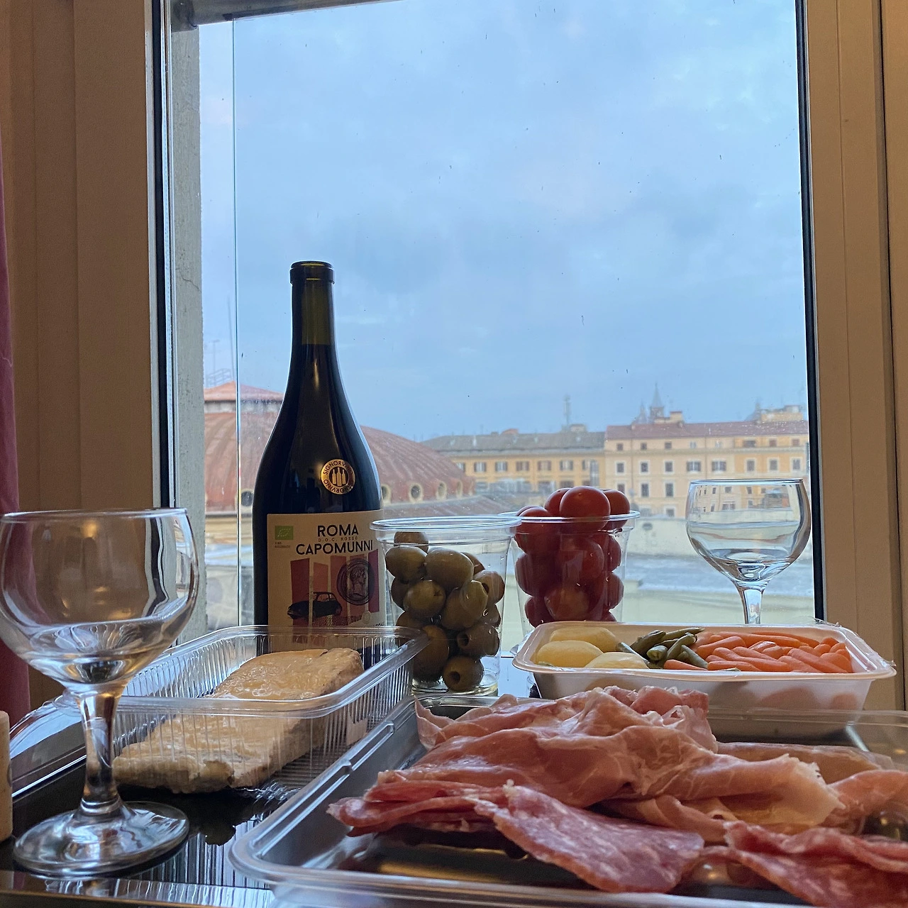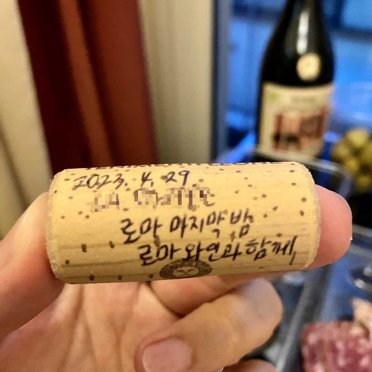 호텔로 돌아와 씻고 마지막 저녁 세팅을 했다. 다 사겠노라며 뛰어갔지만, 막상 두 사람이 사온건 평소와 다름없었다. 방울토마토, 올리브, 고르곤졸라 치즈, 감자와 야채 삶은 것, 약간의 살루미까지. 로마 와인과 곁들일 저녁 메뉴가 차례로 우리가 만든 방안 바(bar)에 차려졌다. 중년생이 이제는 제법 익숙해진 솜씨로 와인 코르크를 오픈했다. (처음엔 서툴러서 코르크를 반토막 냈었는데 한 달 새 일취월장했다. 뿌듯-) “코르크 잠깐 줘봐!” 사회의 말에 중년생이 코르크를 건넸고, 사회는 볼펜으로 그 위에 무언가를 열심히 적었다. ‘2023. 4. 29. 로마 마지막 밤 로마 와인과 함께’