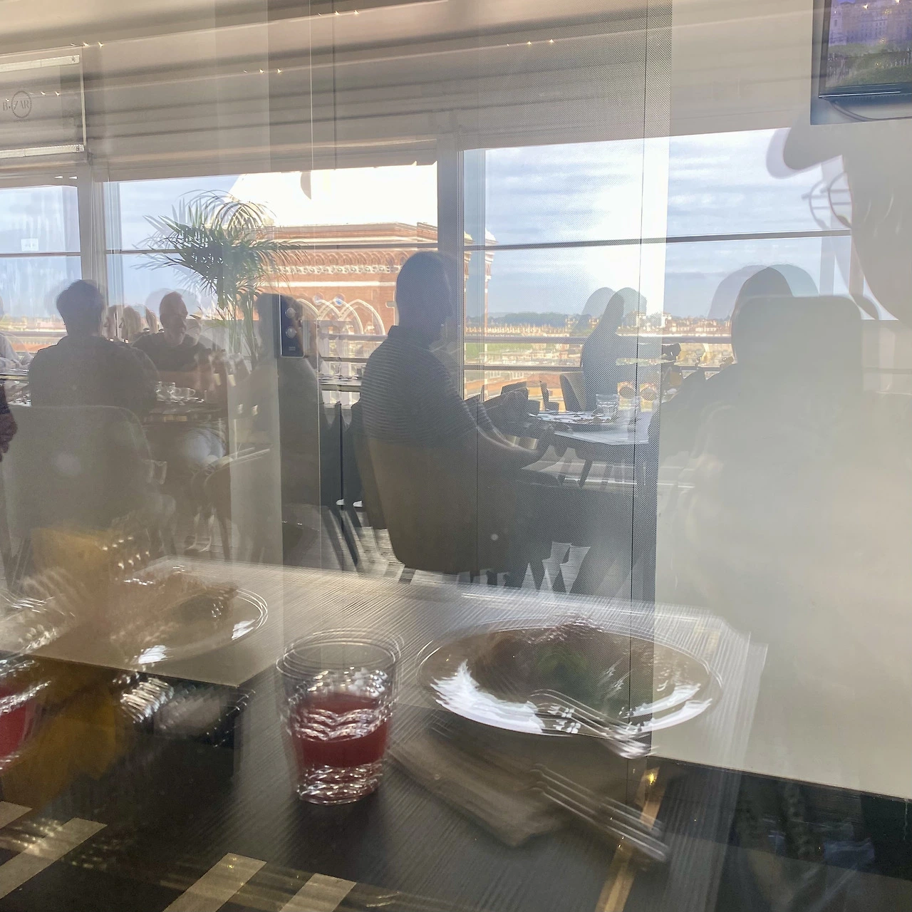 “내일은 아마 조식 안 먹겠지?” 사회의 말에 중년생이 고개를 살짝 기울이고는 잠깐 생각을 해보더니 가만히 고개를 끄덕이며 대답했다. “짐 싸느라 정신없을 테니 내일은 먹지 말자.” 순간, 사실상 이곳에 올라오는 것이 마지막이라는 생각에 루프탑과 로마 시내 모습을 사진으로 남기고 싶어졌다. 하지만 그러려면, 우리 테이블 위치가 가장 안쪽이라서 한창 식사 중인 다른 투숙객 쪽으로 카메라를 들이대야만 했다. 그래서 선택한 대안. 테이블 안쪽의 유리벽면에 반사된 루프탑의 모습을 찍어두기로 했다. 풍경은 생생하게 담기지 않겠지만, 사진을 볼 때마다 이 당시의 상황만큼은 아주 생생하게 떠오를 것 같아서였다. 그렇게 (사실 셔터소리는 안 났지만) 찰칵-